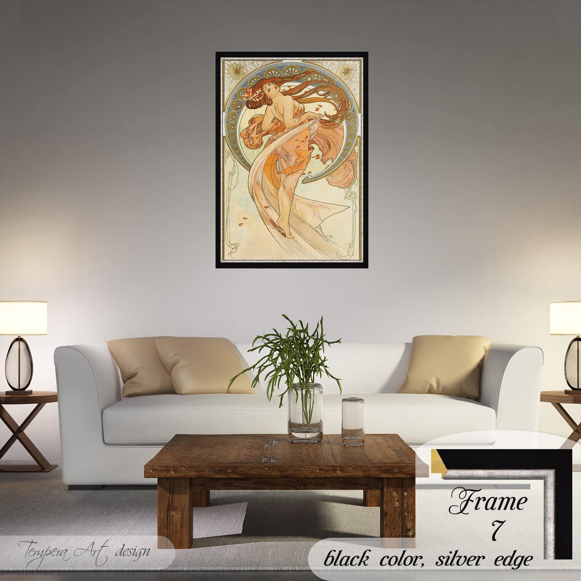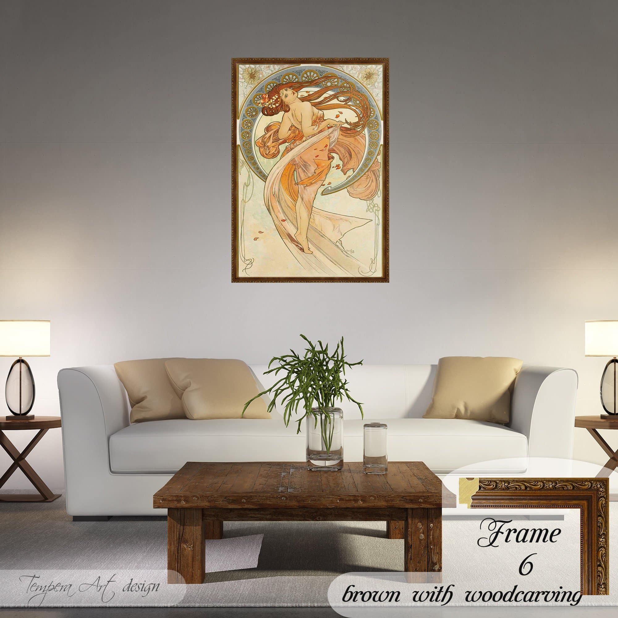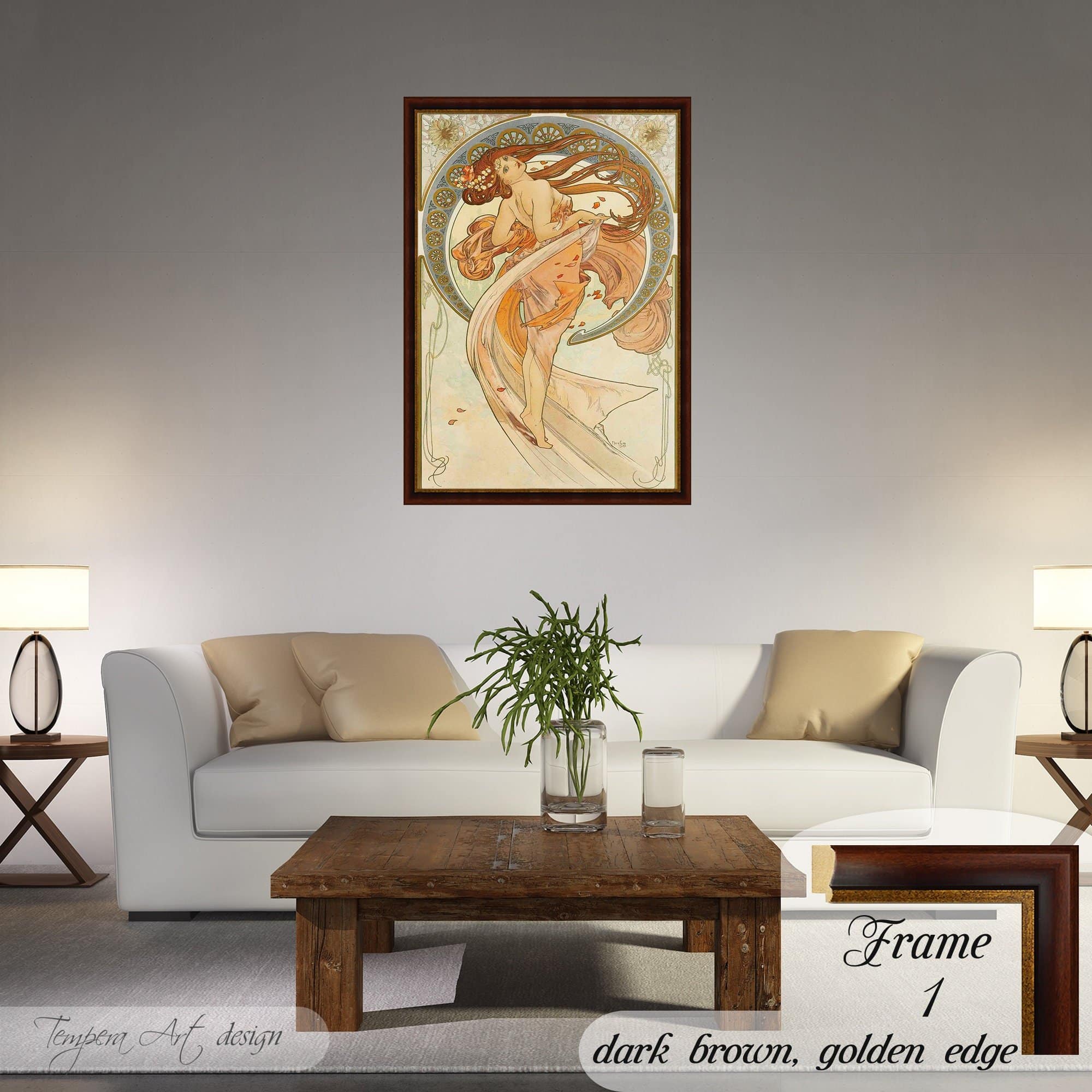 Alphonse Mucha Dance canvas print offered with different wooden frames or as an unframed wall art decor.