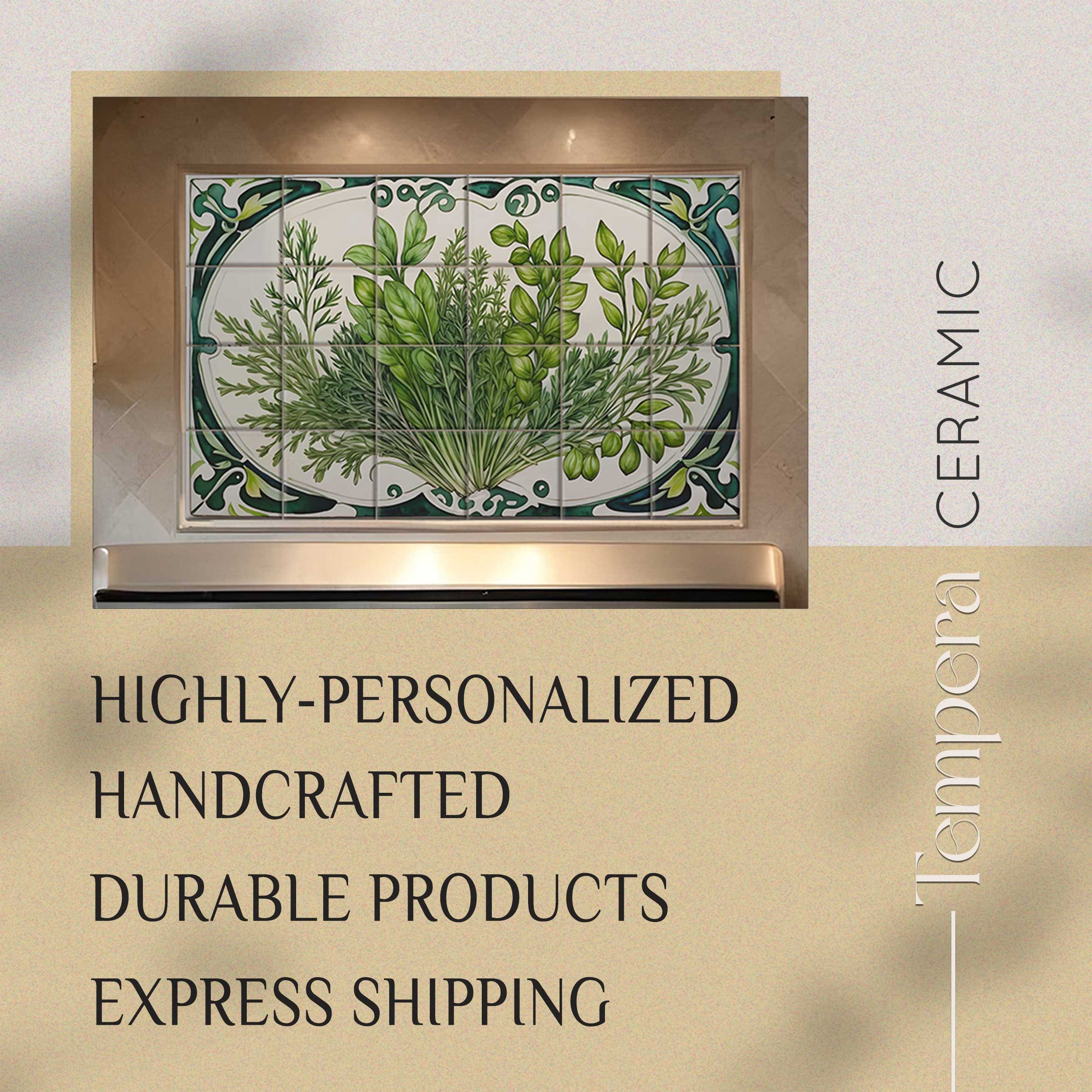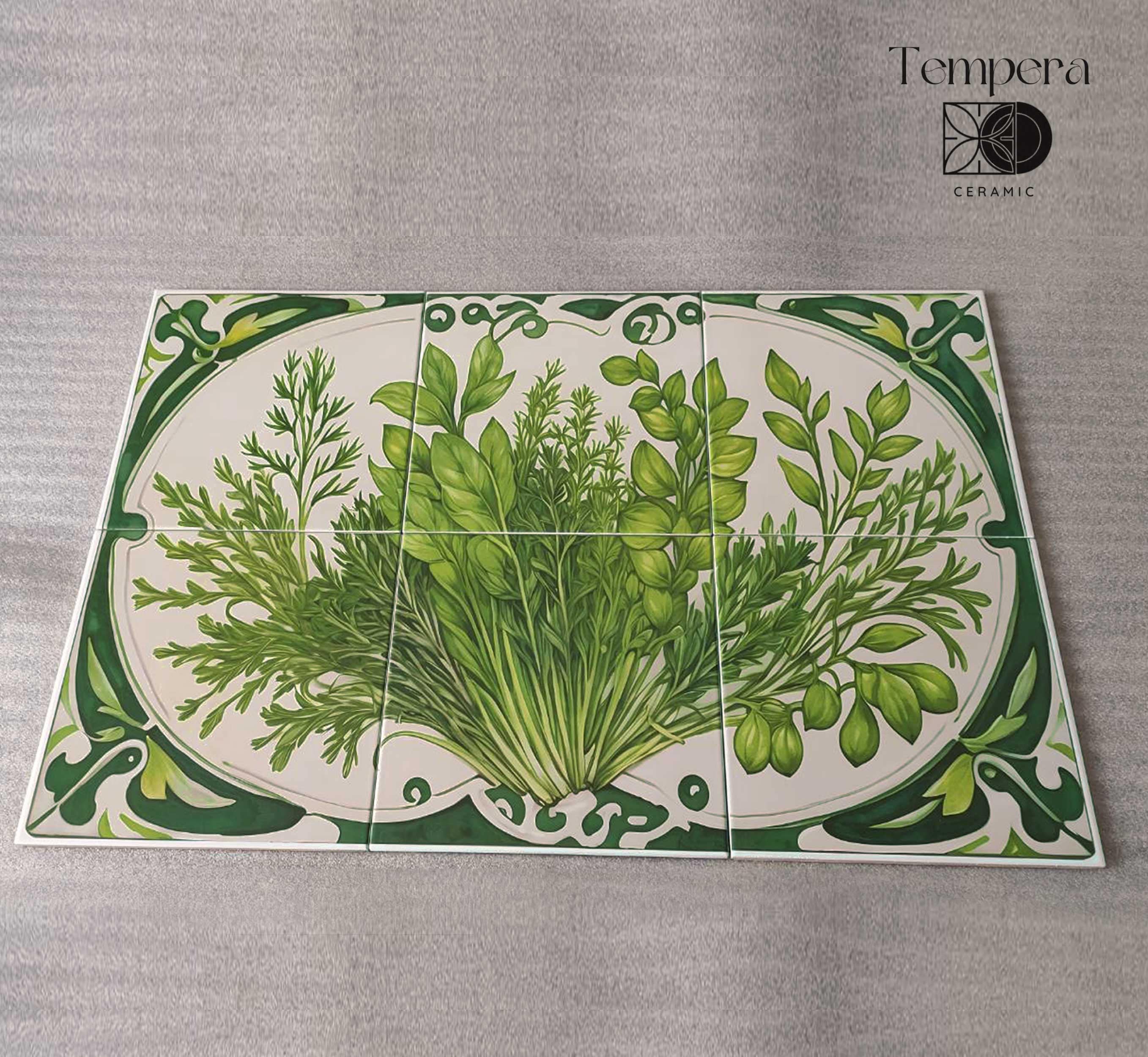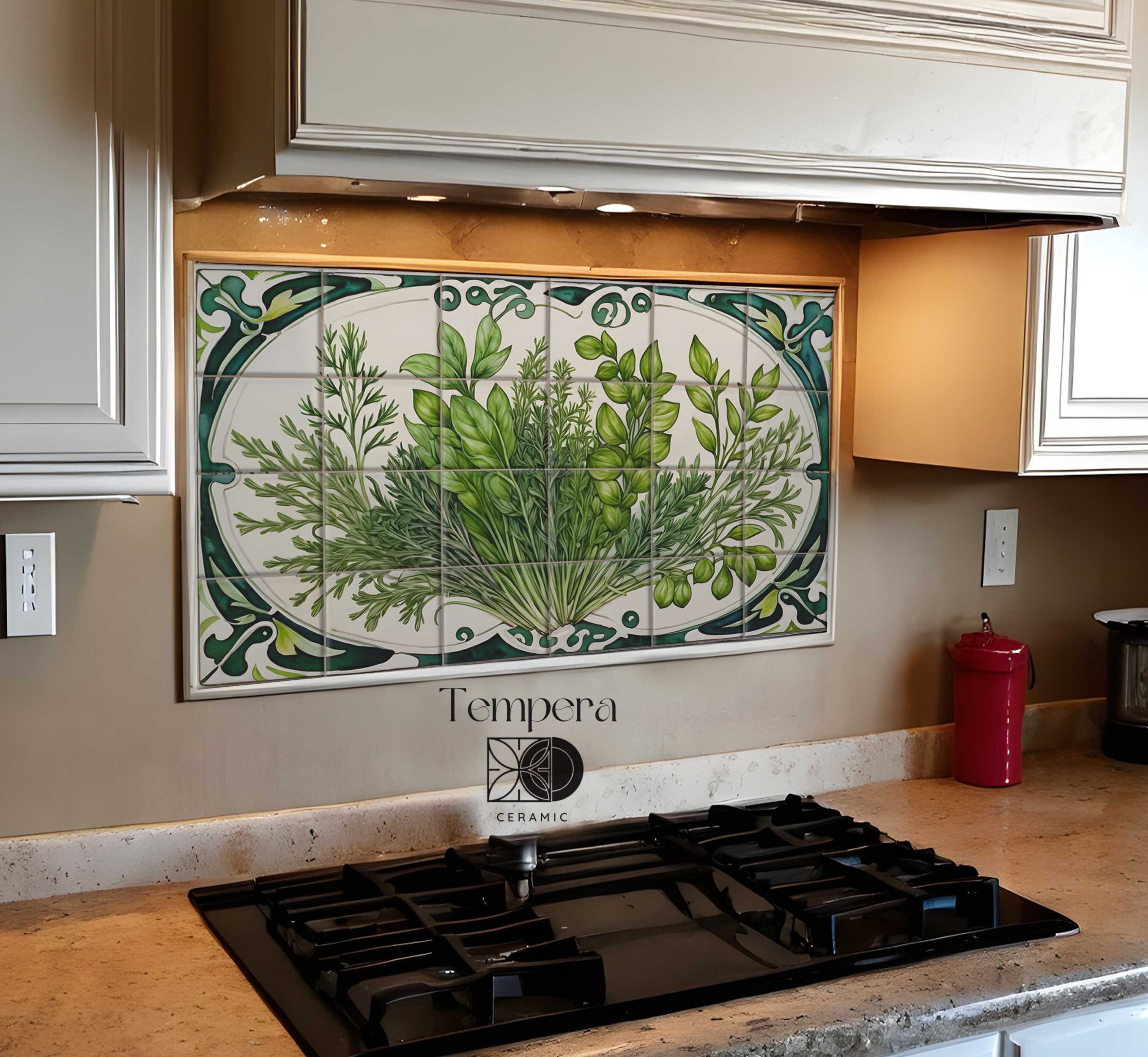 Backsplash Herbs Art Nouveau tiles mural, handcrafted and custom-made to fit your space. Our tiles are both unique and made to last. We can offer various customizations of the design and the sizes, or we can bring your vision to life with a completely different and unique look.