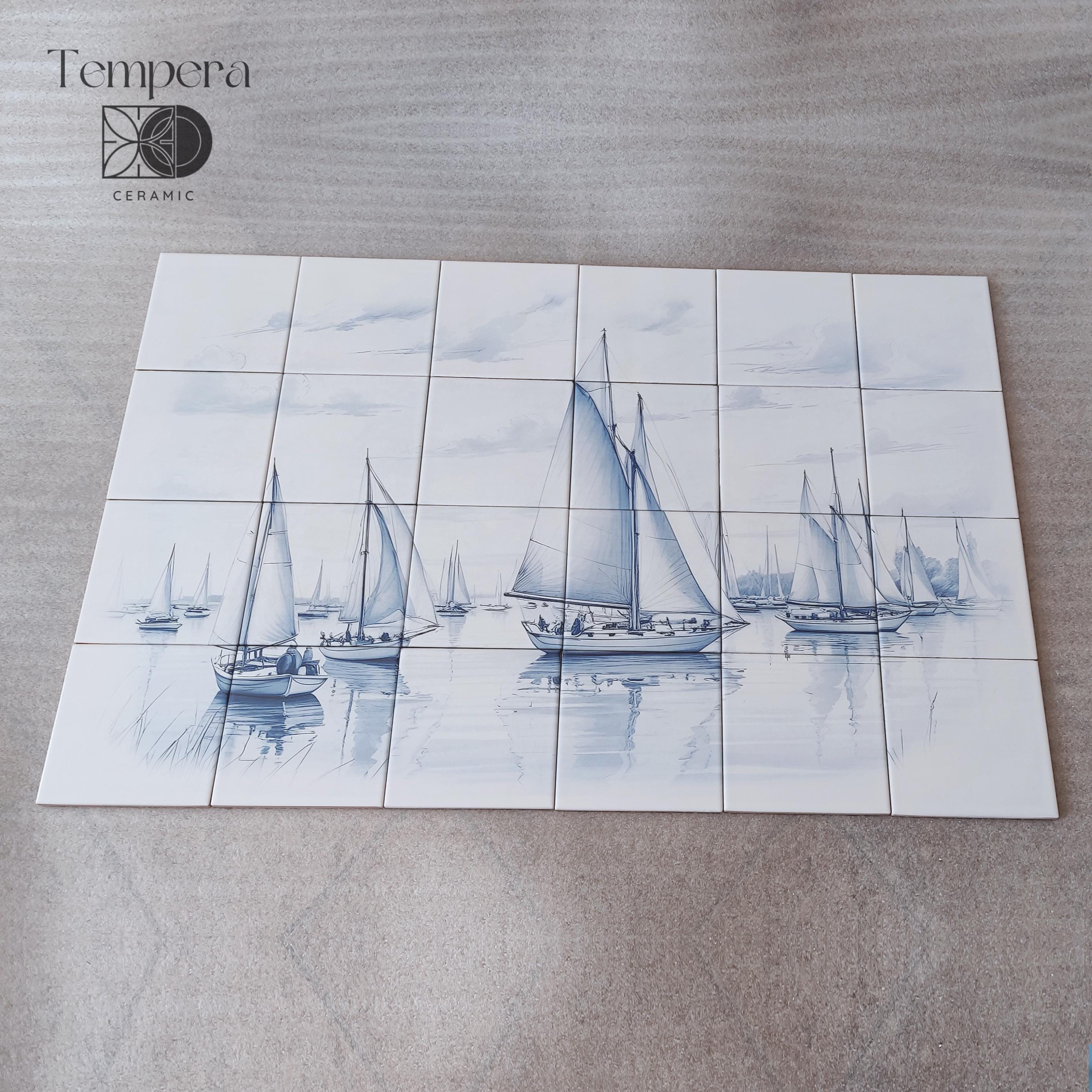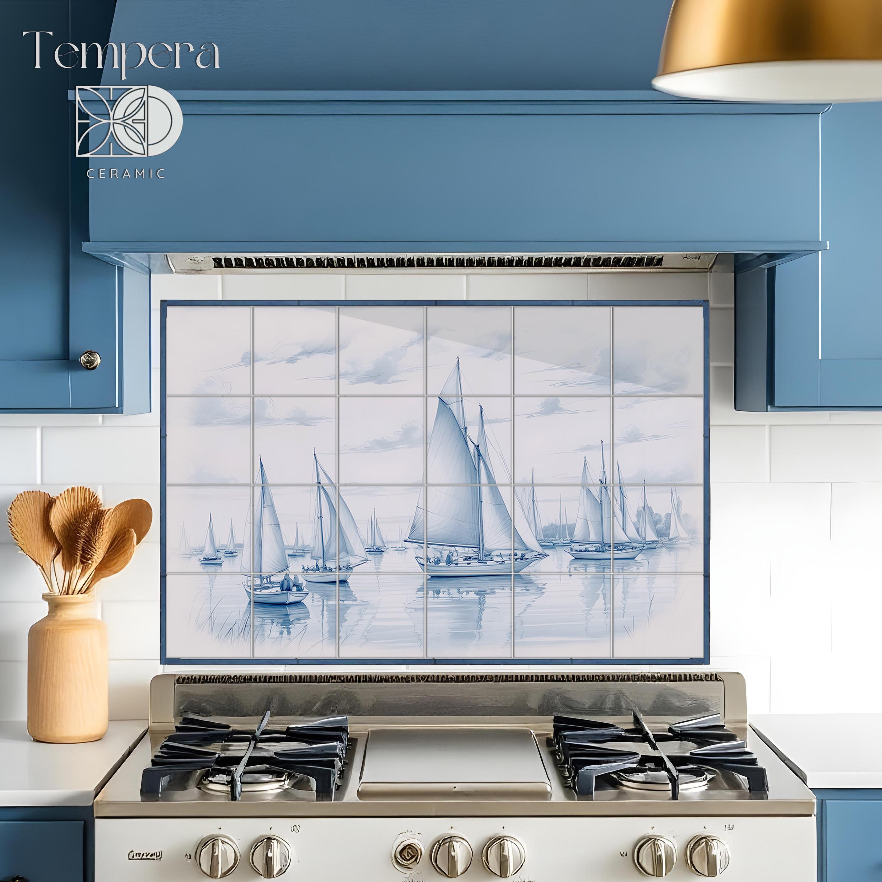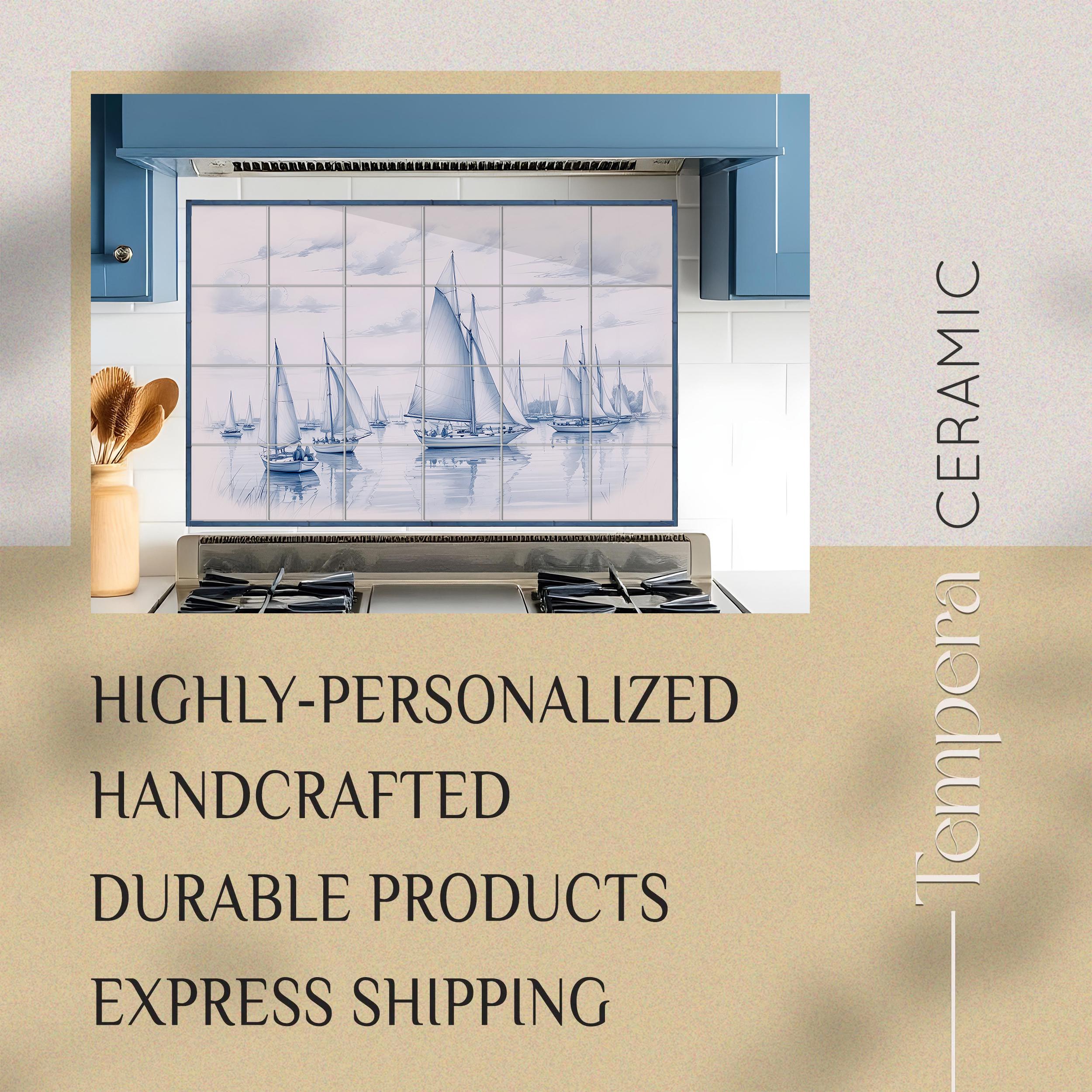 Blue – white backsplash tiles with a fleet of sailboats on a calm body of water, with cloudy skies. Each tile is printed with high-quality image that goes deep into the coating layer of the tile, ensuring the durability of the product.