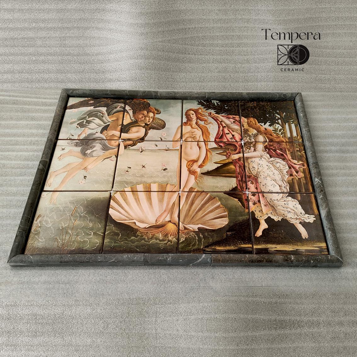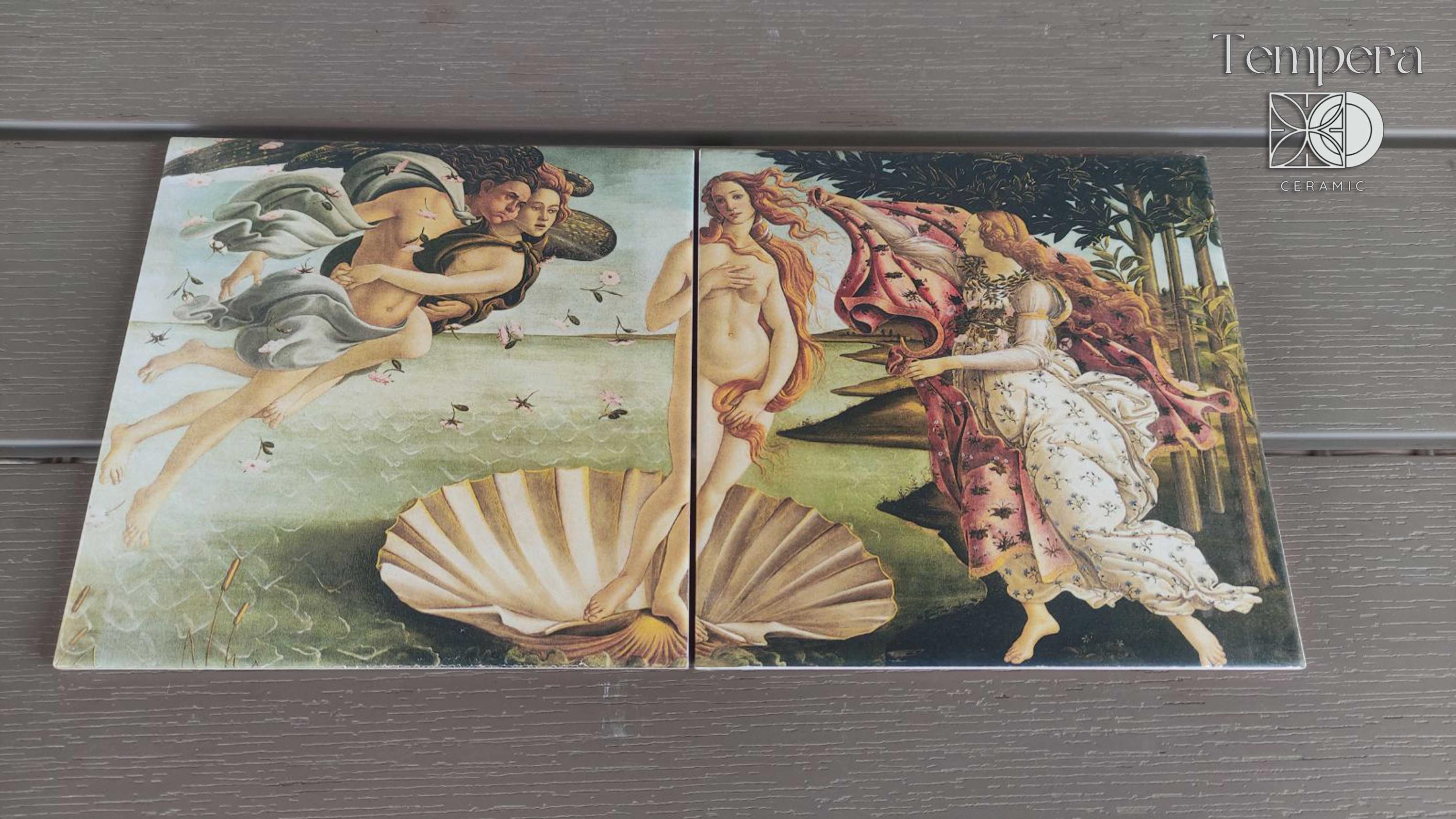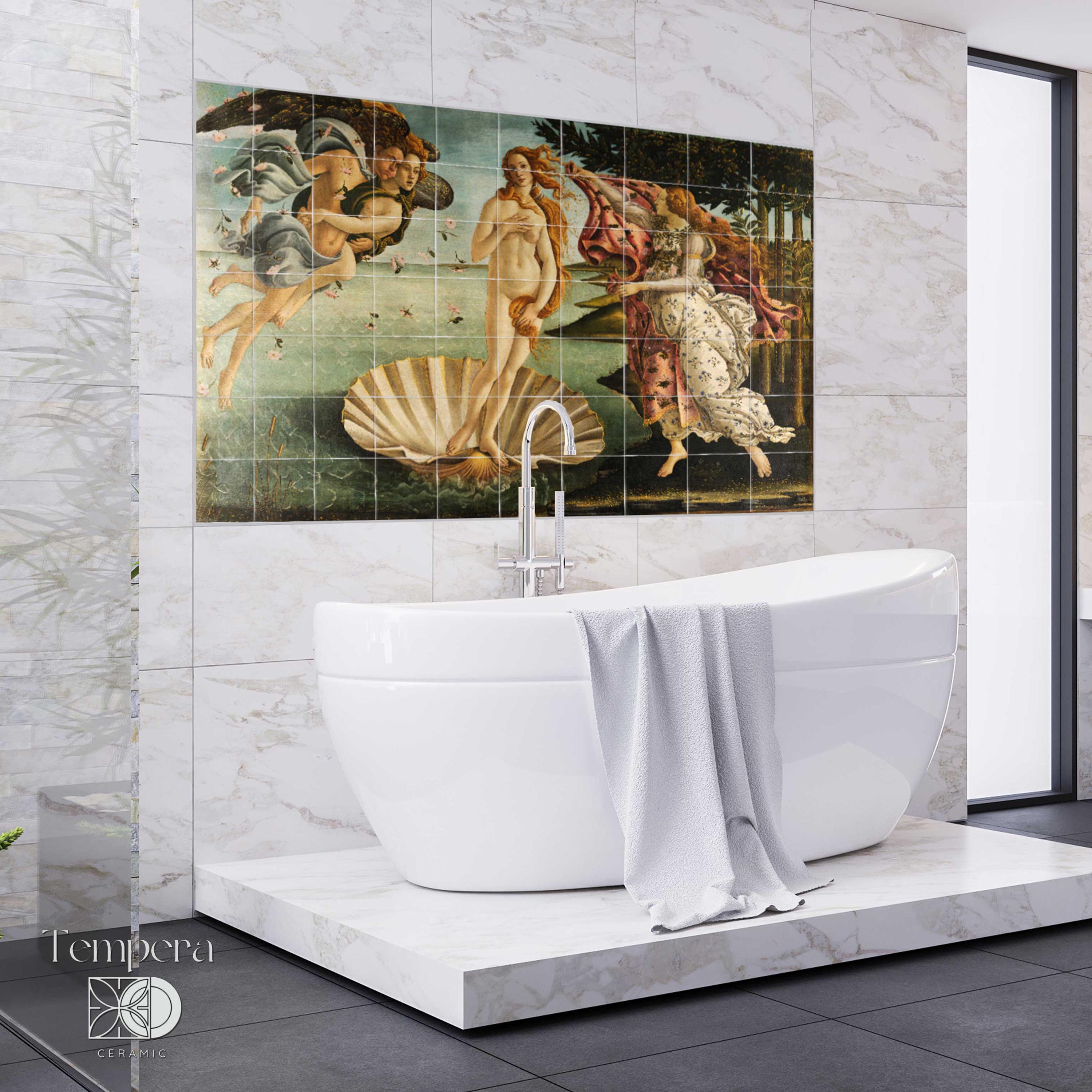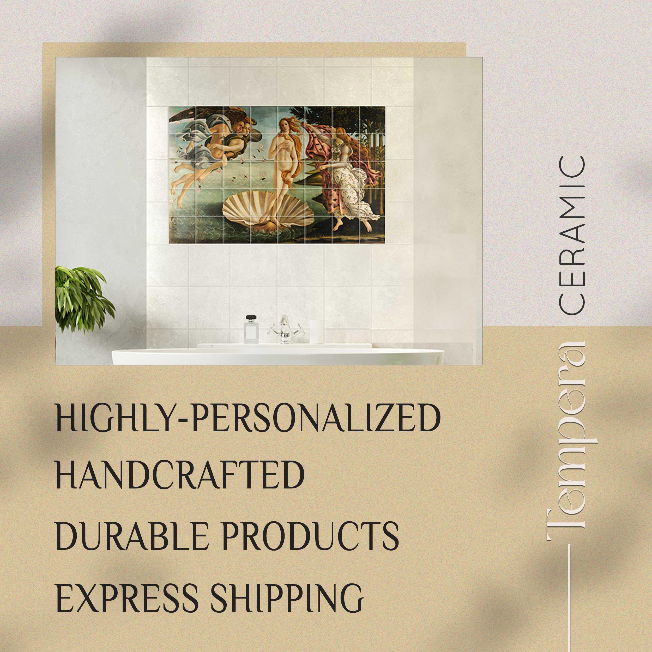 Birth Of Venus by Botticelli tiles mural, handcrafted and custom-made to fit your space. Our tiles are both unique and made to last. We can offer various customizations of the design and the sizes, or we can bring your vision to life with a completely different and unique look.