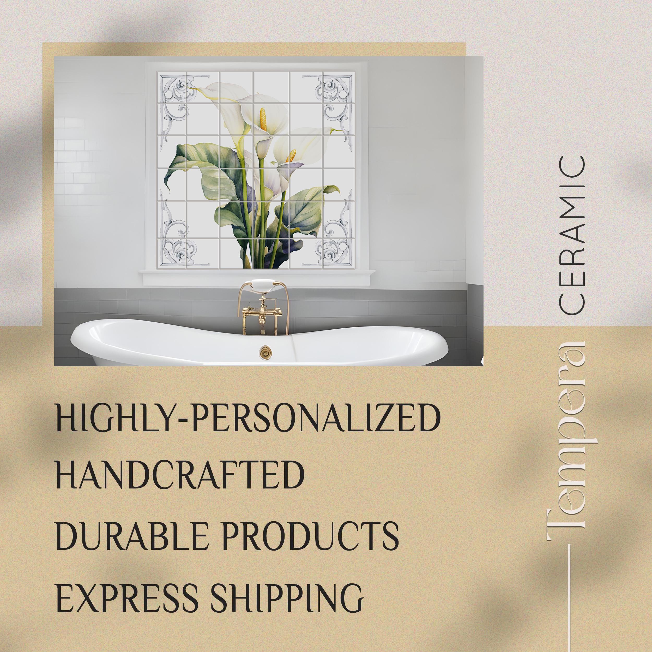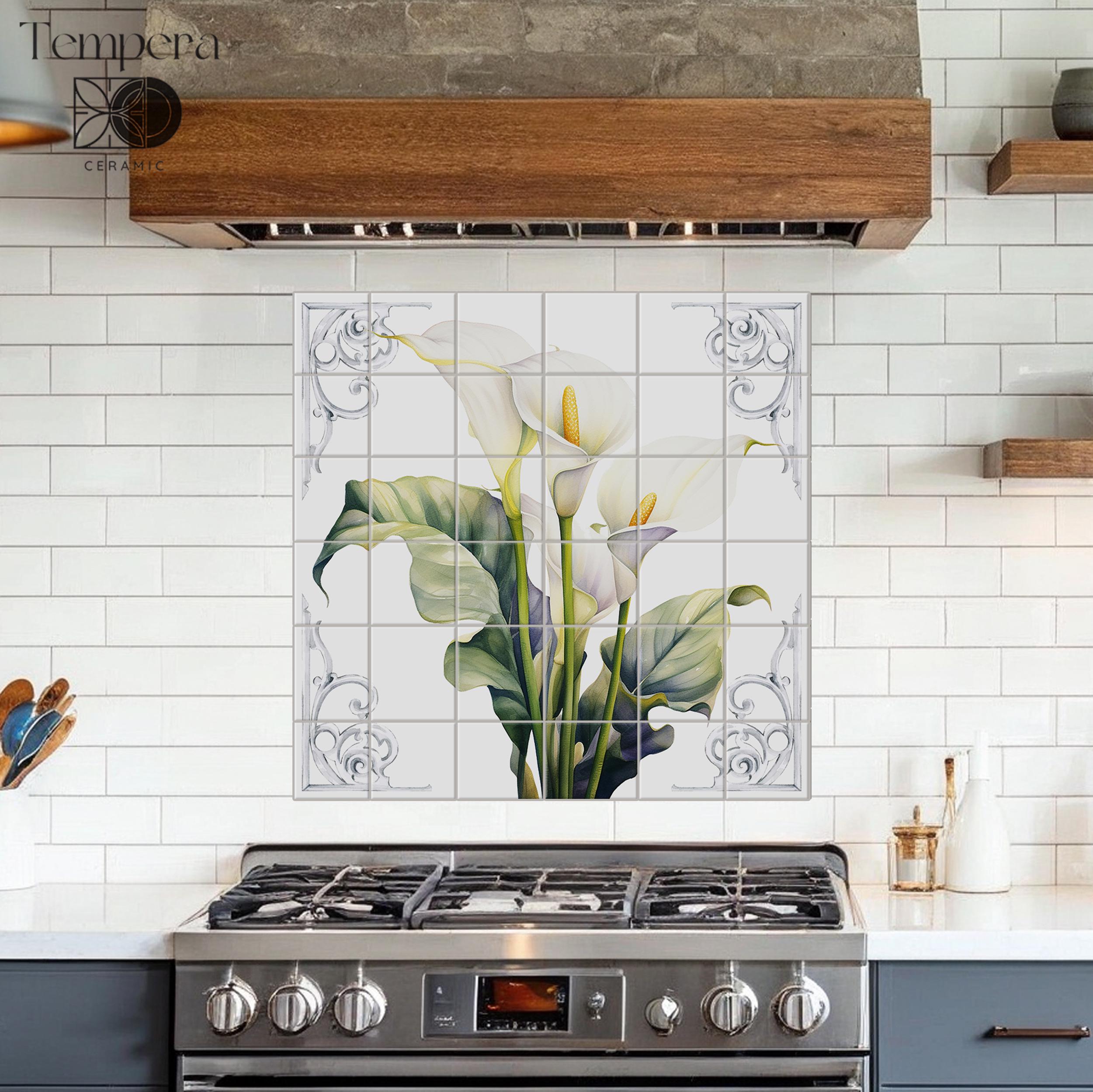 Calla Lily flowers accent tiles, handcrafted and custom-made to fit your space. Our tiles are both unique and made to last. We can offer various customizations of the design and the sizes, or we can bring your vision to life with a completely different and unique look.