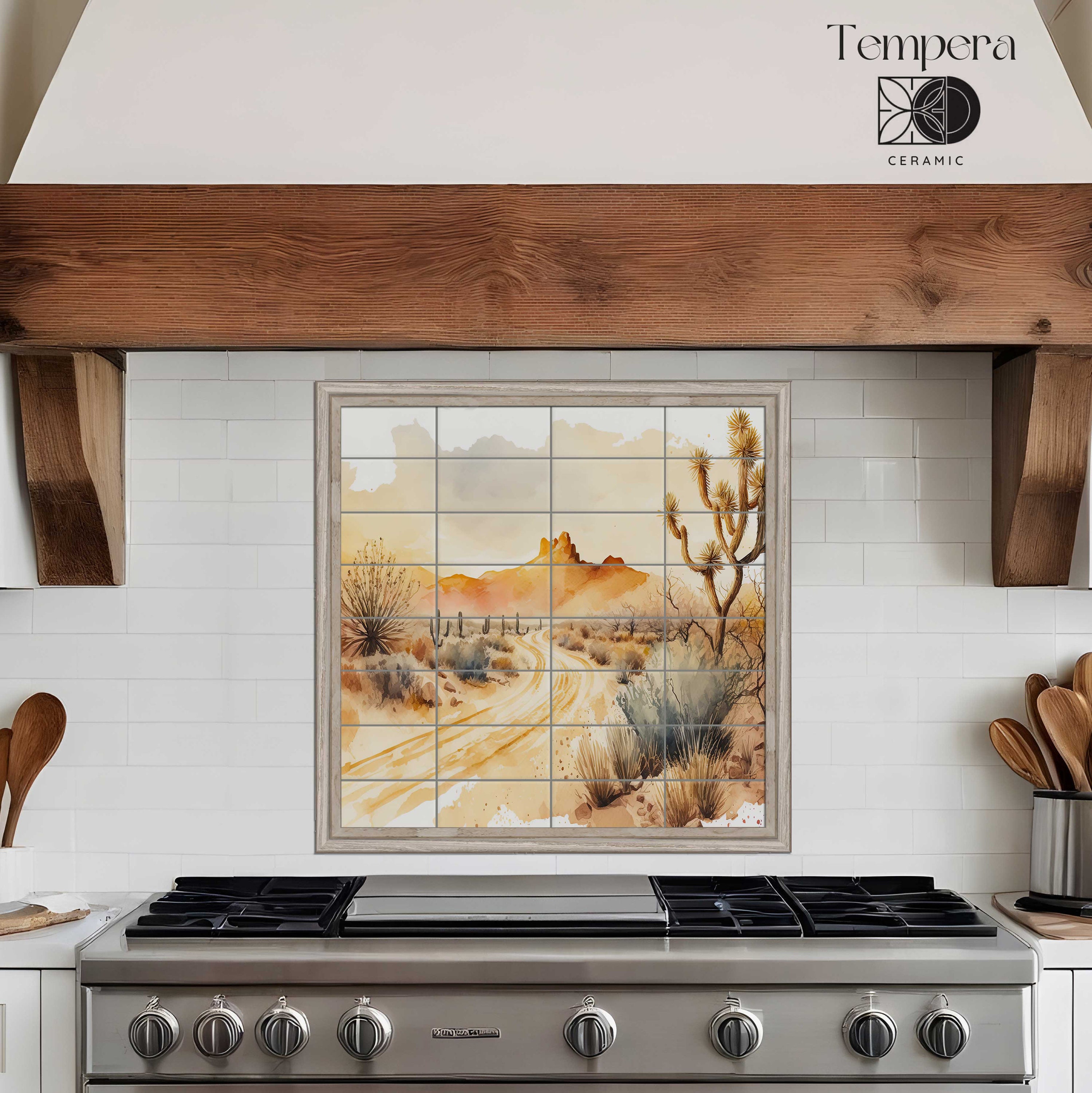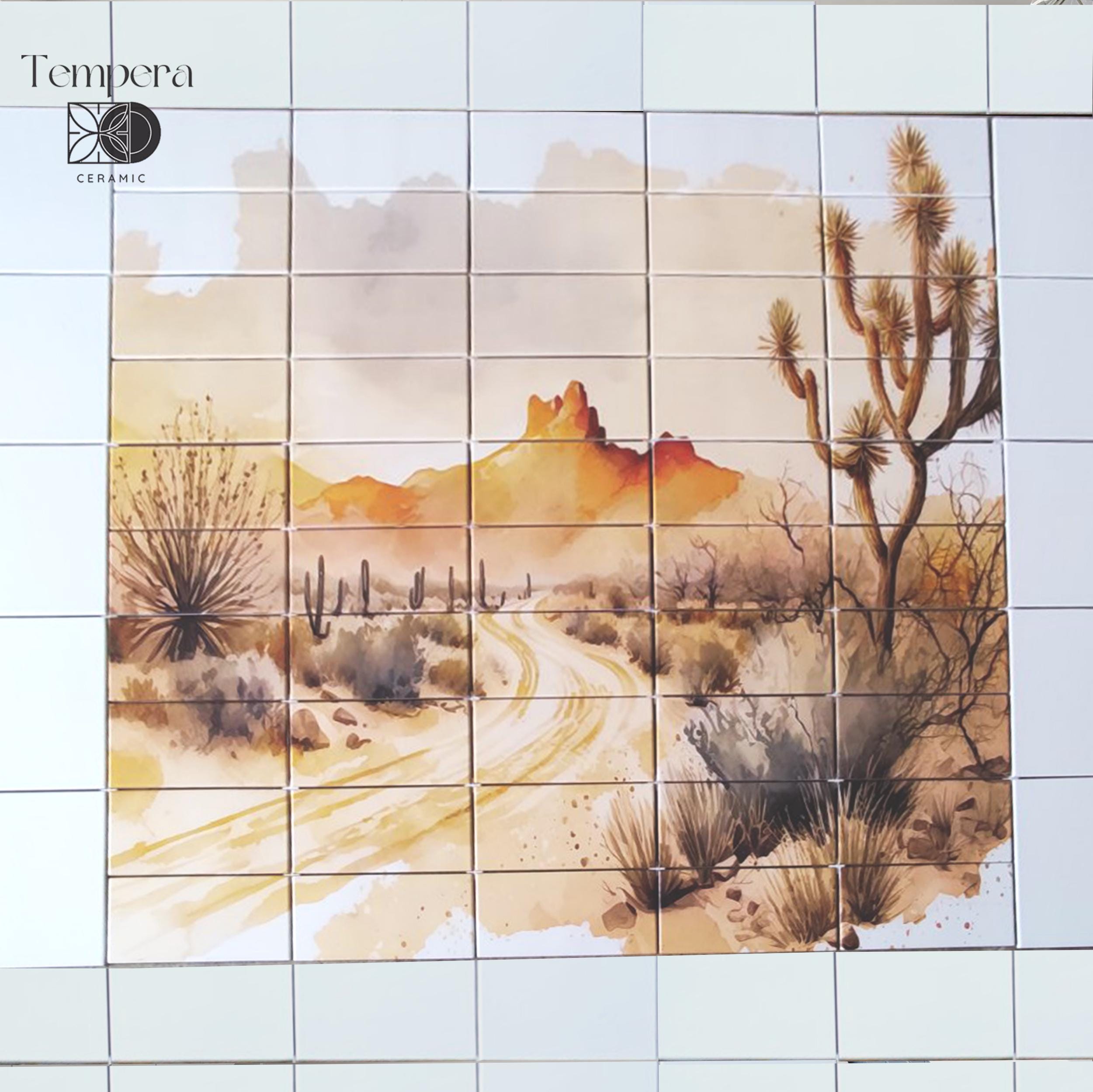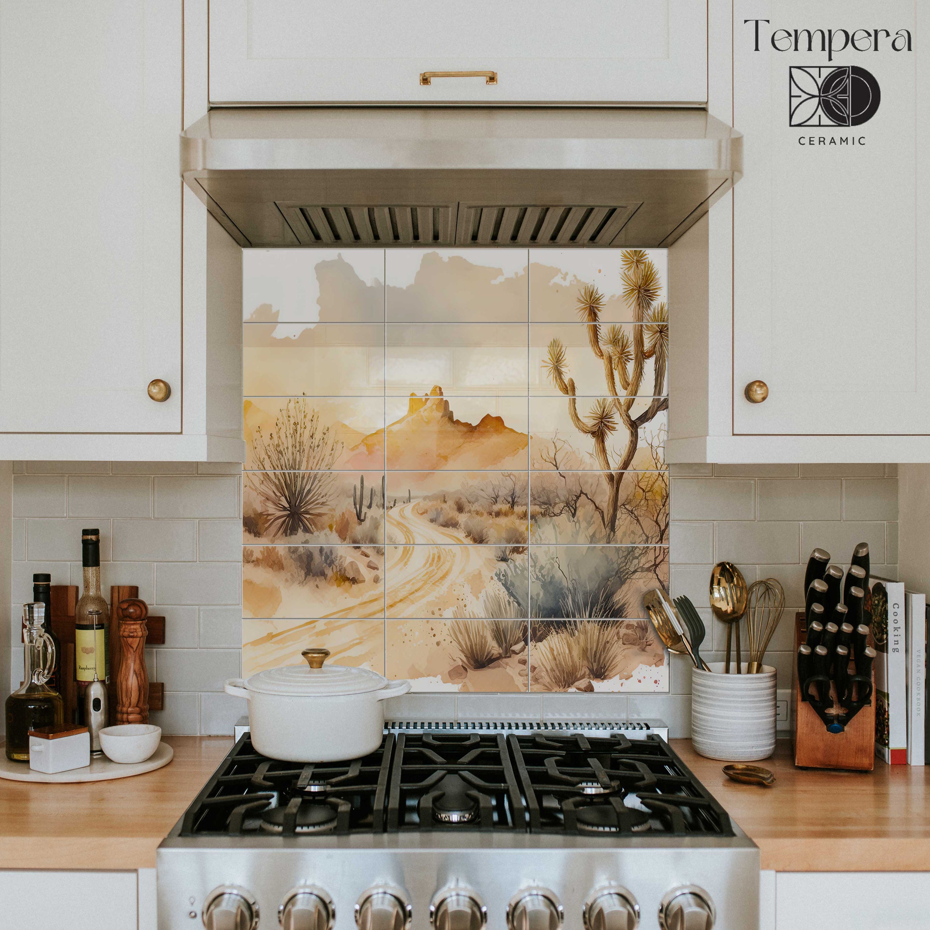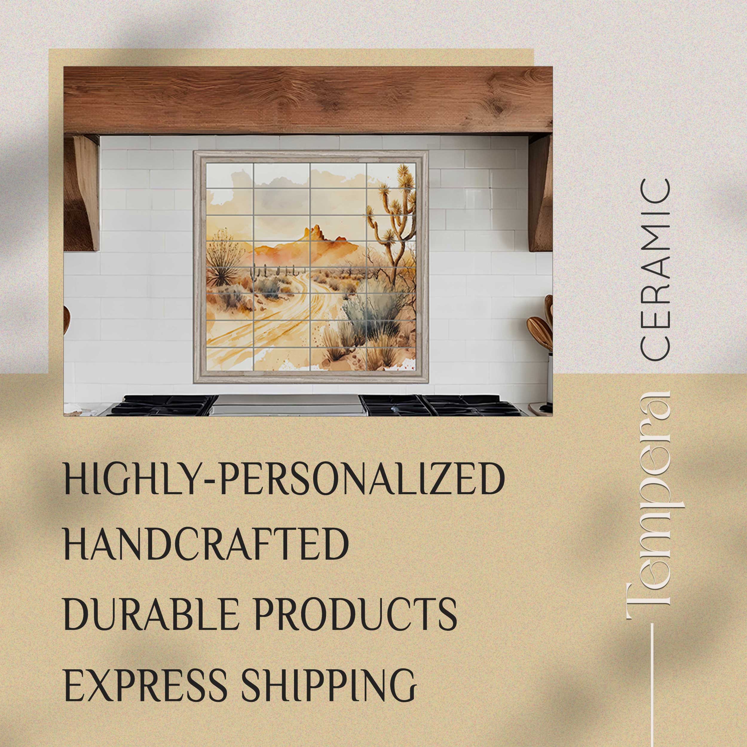 Backsplash Texas desert mural, handcrafted and can be custom-made to fit your space. Our tiles are both unique and made to last. We can offer various customizations of the design and the sizes, or we can bring your vision to life with a completely different and unique look.