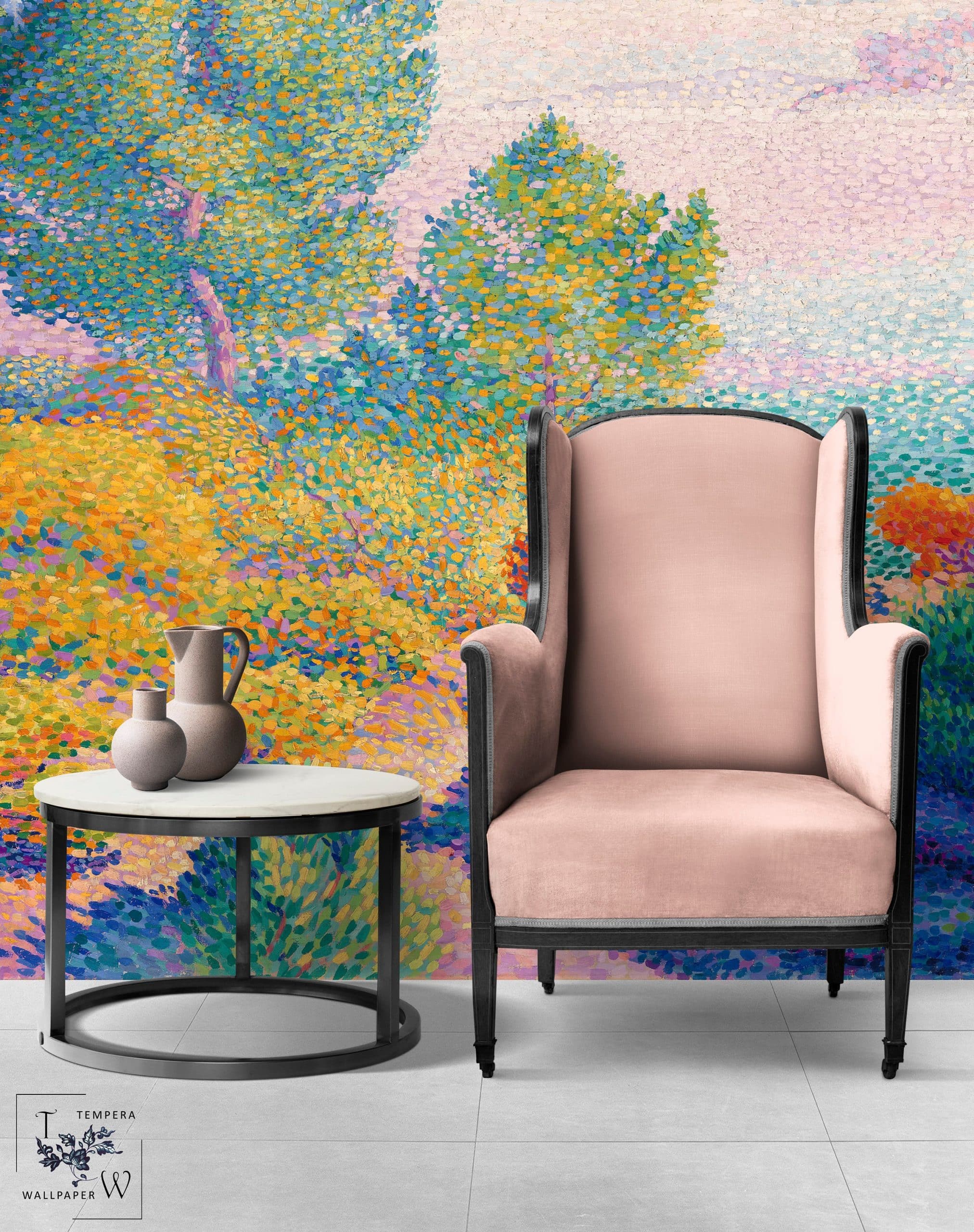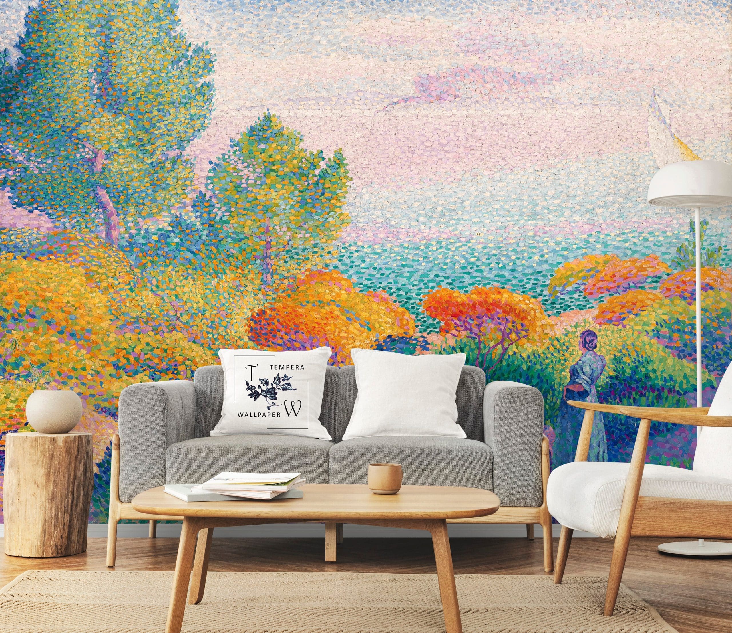 Wallpaper art, wallpaper print of the painting “Two Women by the Shore, Mediterranean” by Henri-Edmond Cross. Self-Adhesive or Regular Paper Wallpaper.