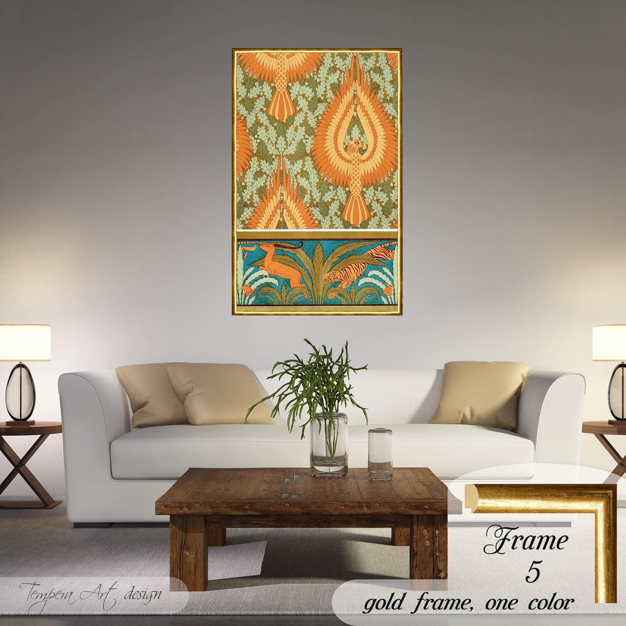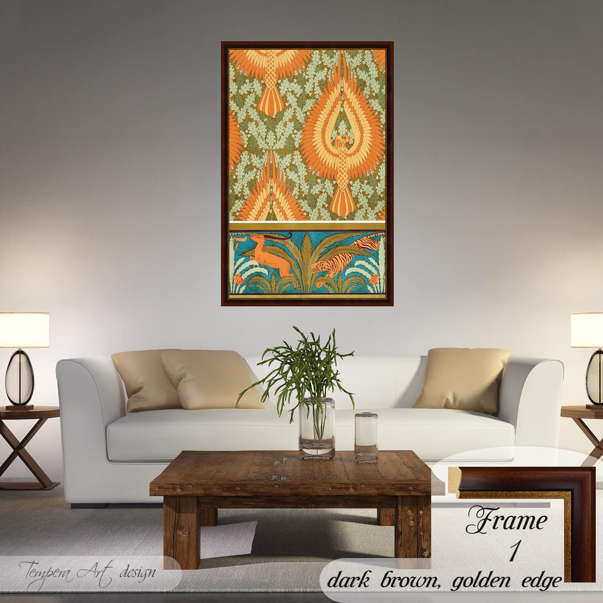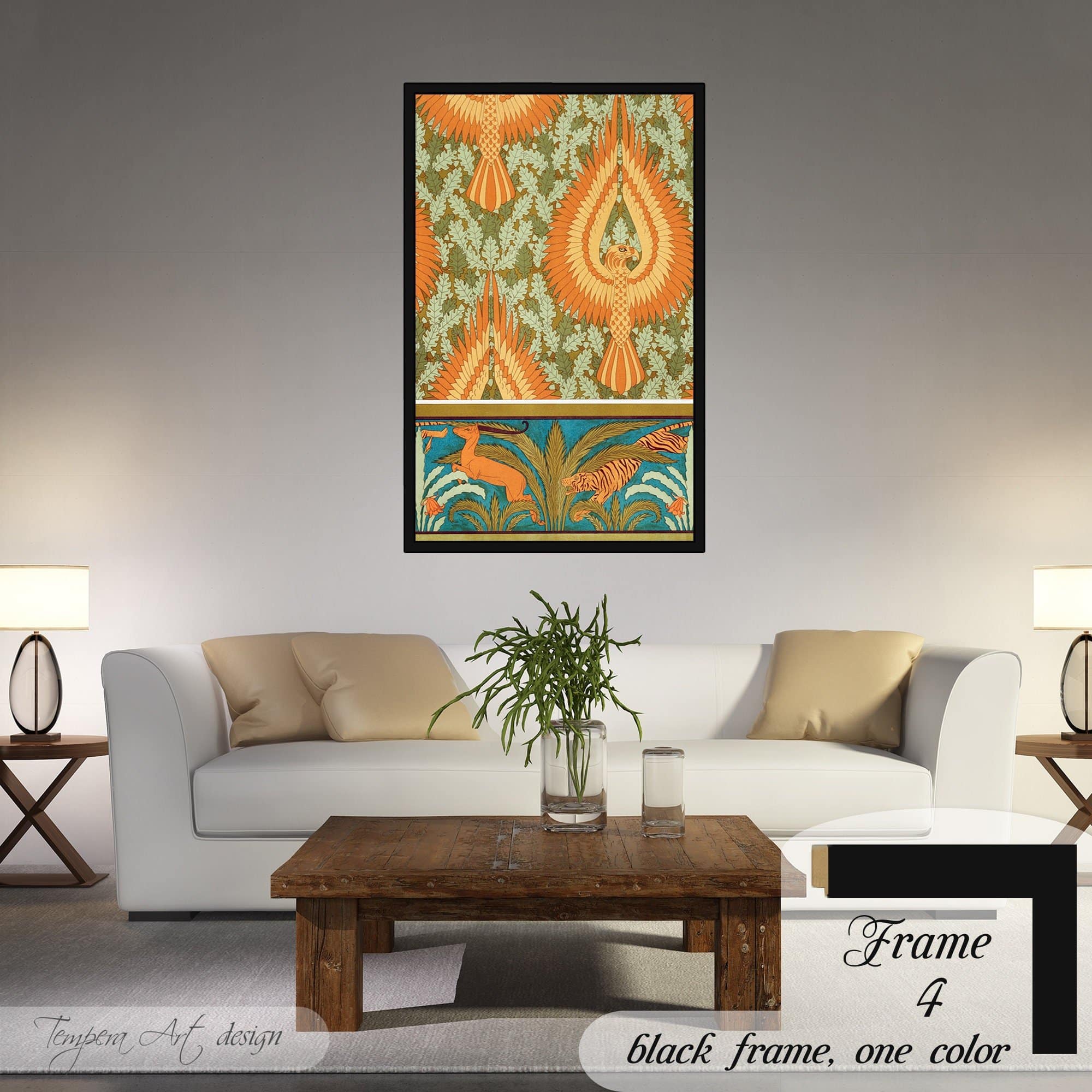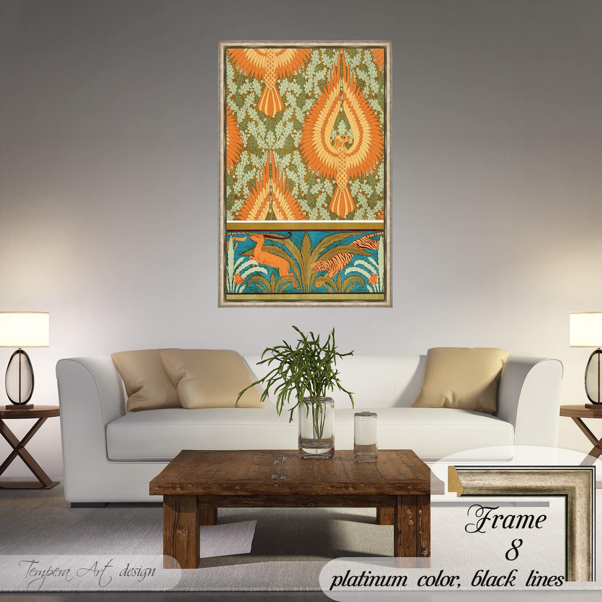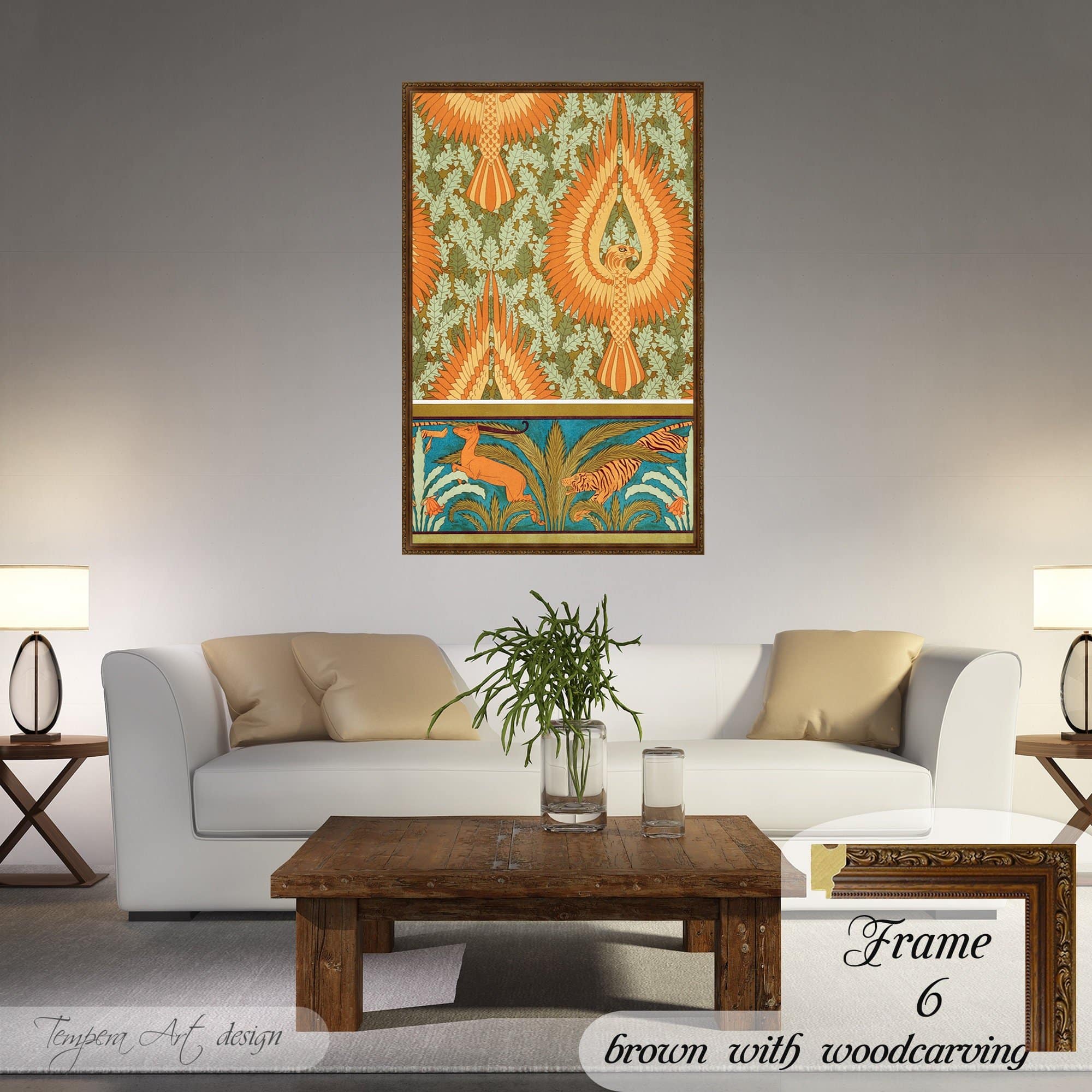 Maurice Pillard Verneuil “Aigles et chêne, papier peint. Antilopes, tigres, cactus et palmiers, bordure.” (Eagles and oak) from L’animal dans la décoration print on canvas offered with different wooden frames or as an unframed wall art.