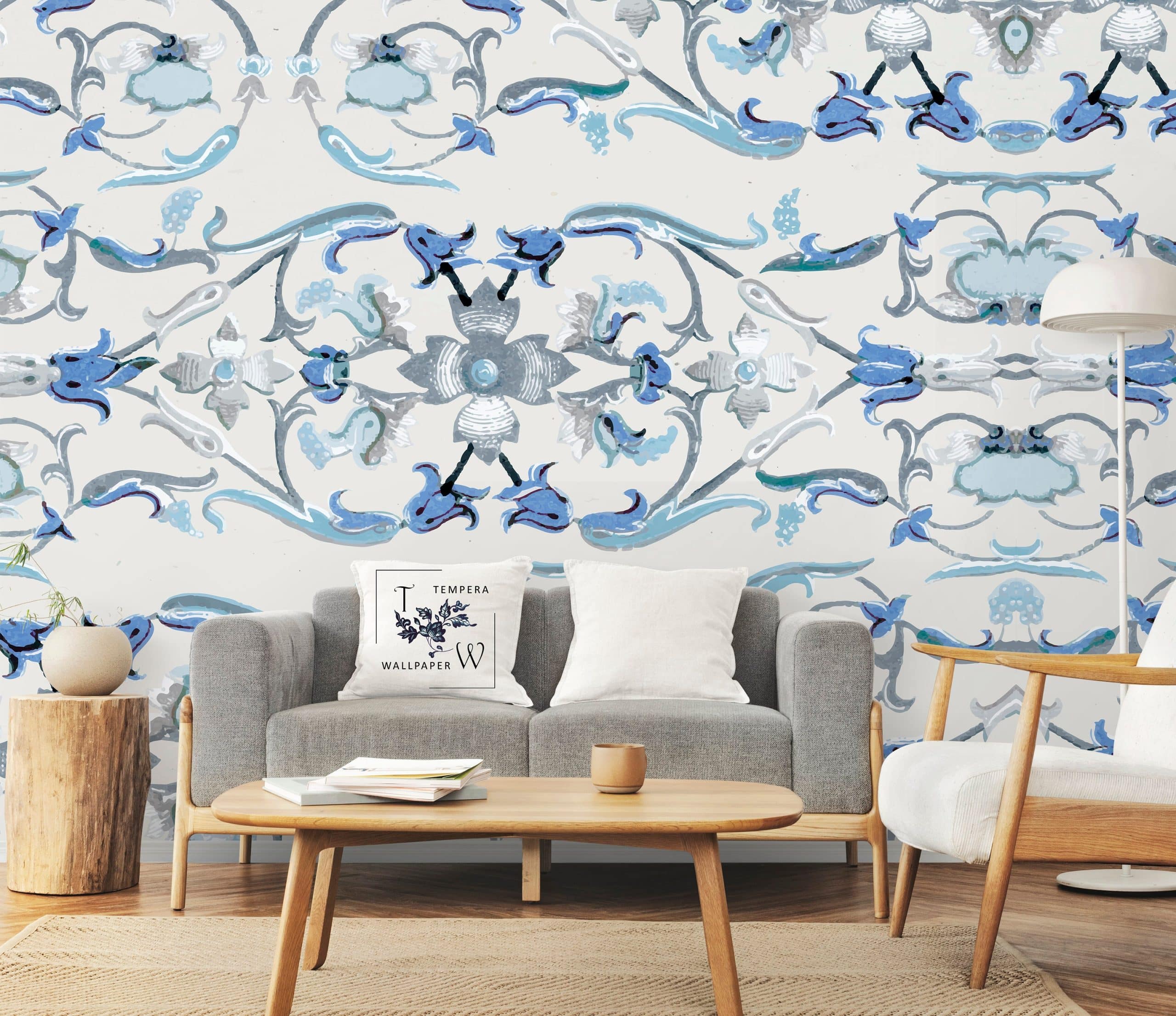 Navy blue floral patterned wallpaper, vintage floral wallpaper, wallpaper print with flowers. Self-Adhesive or Regular Paper Wallpaper.