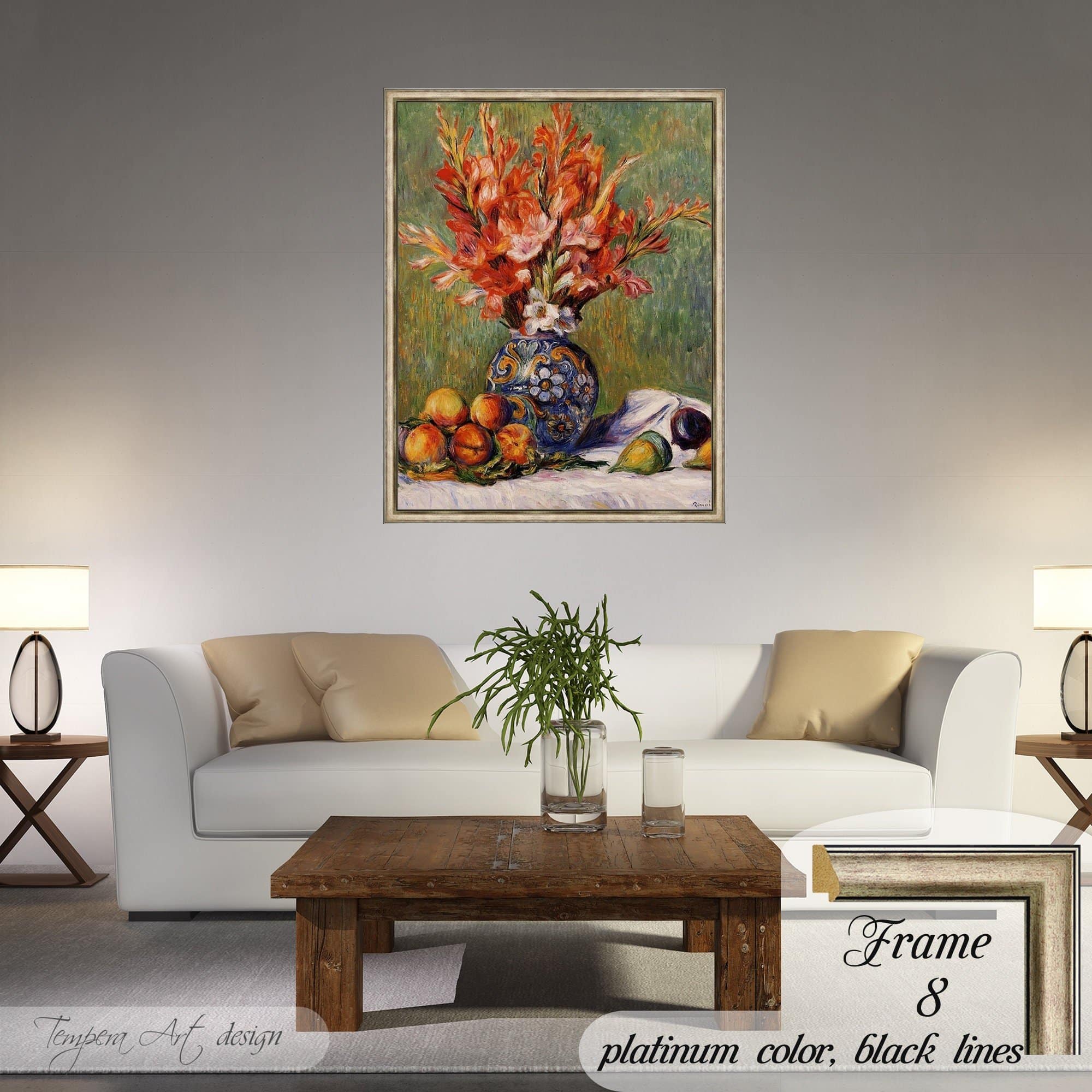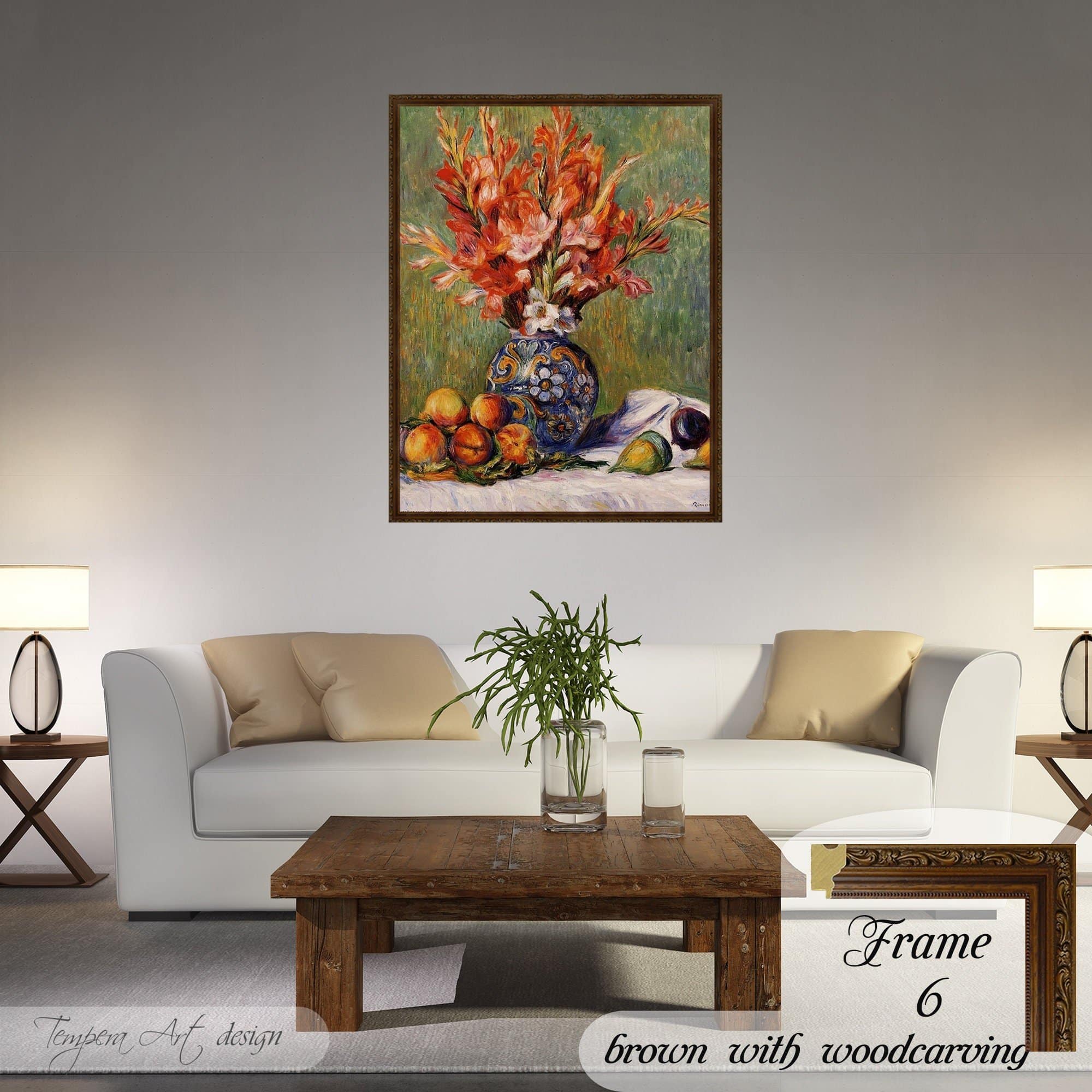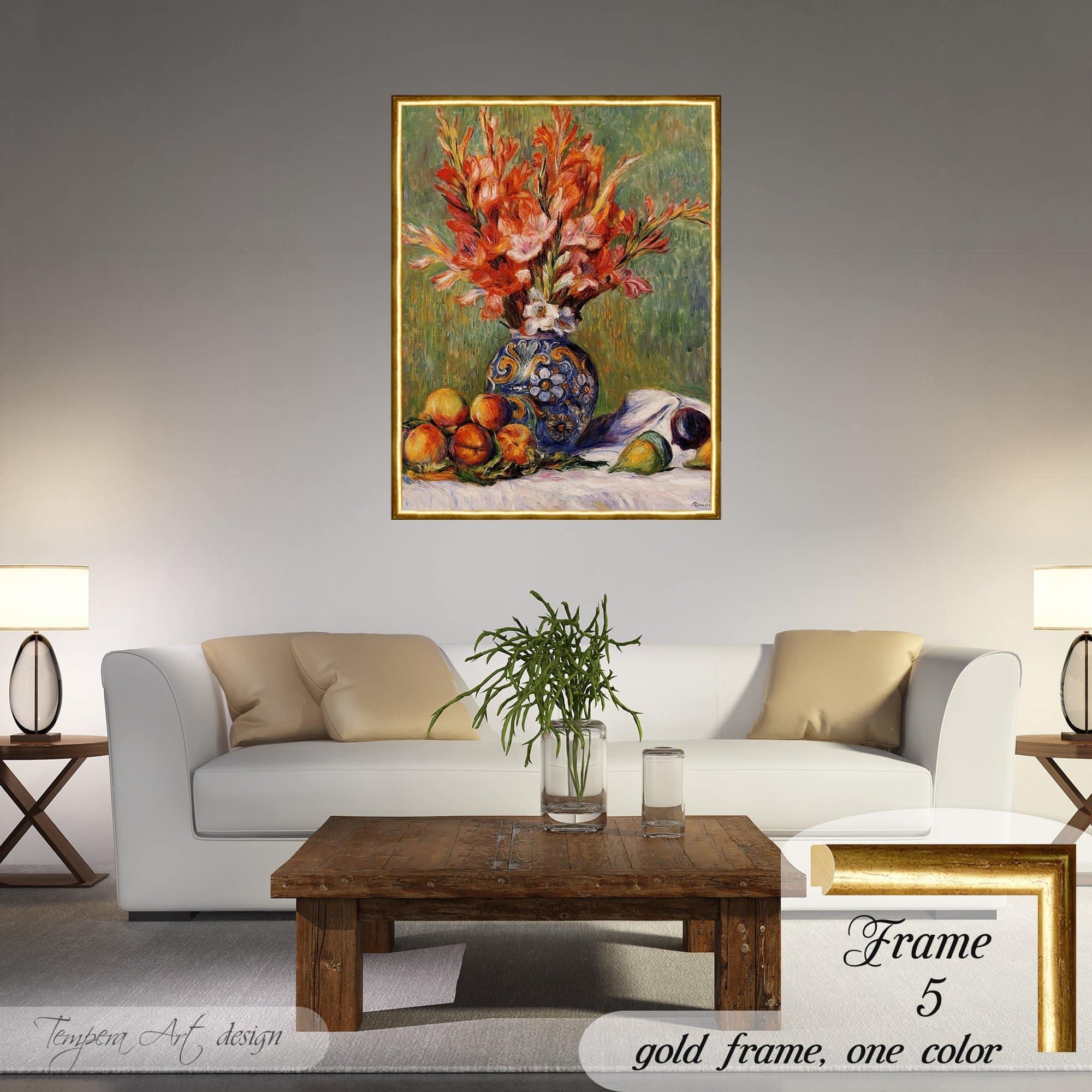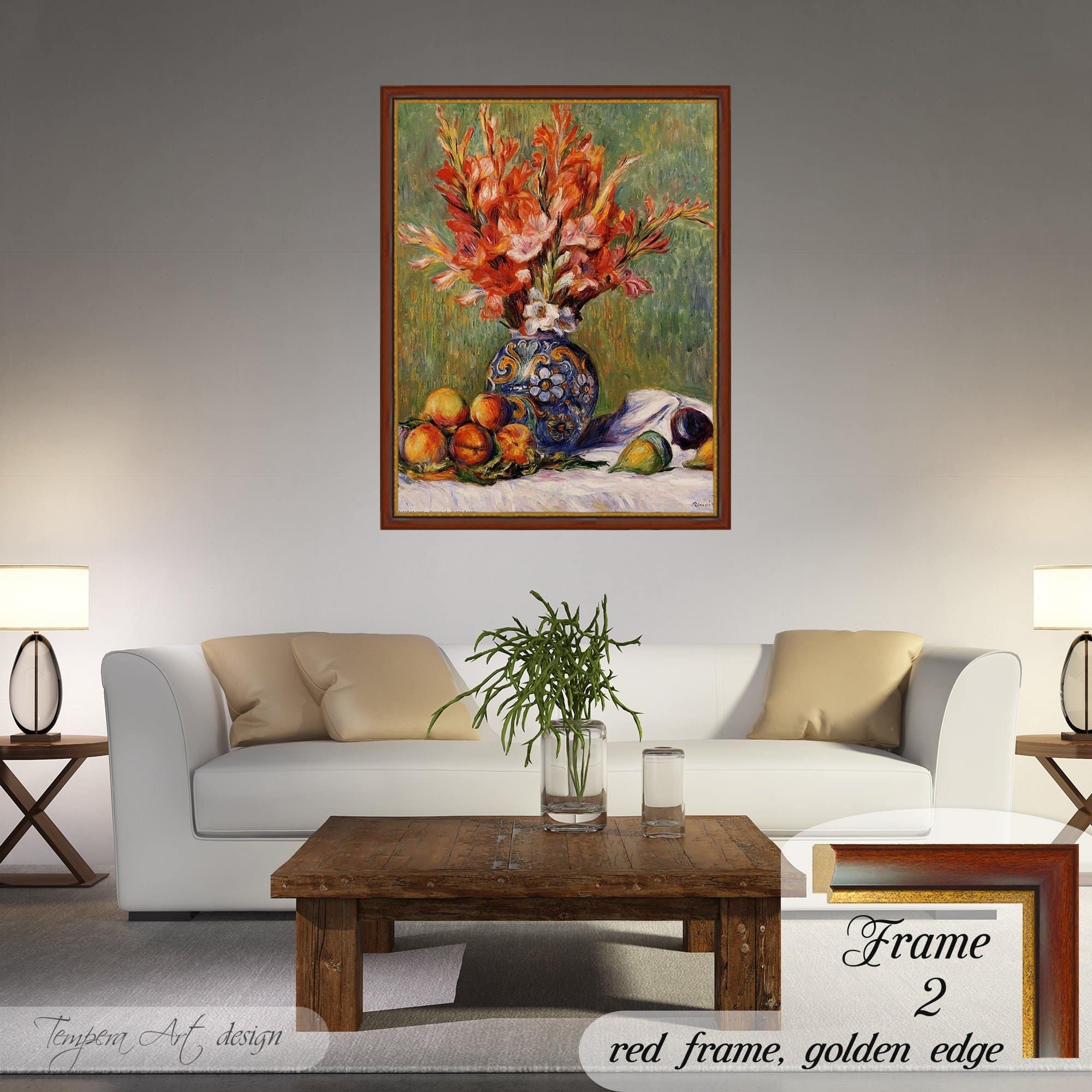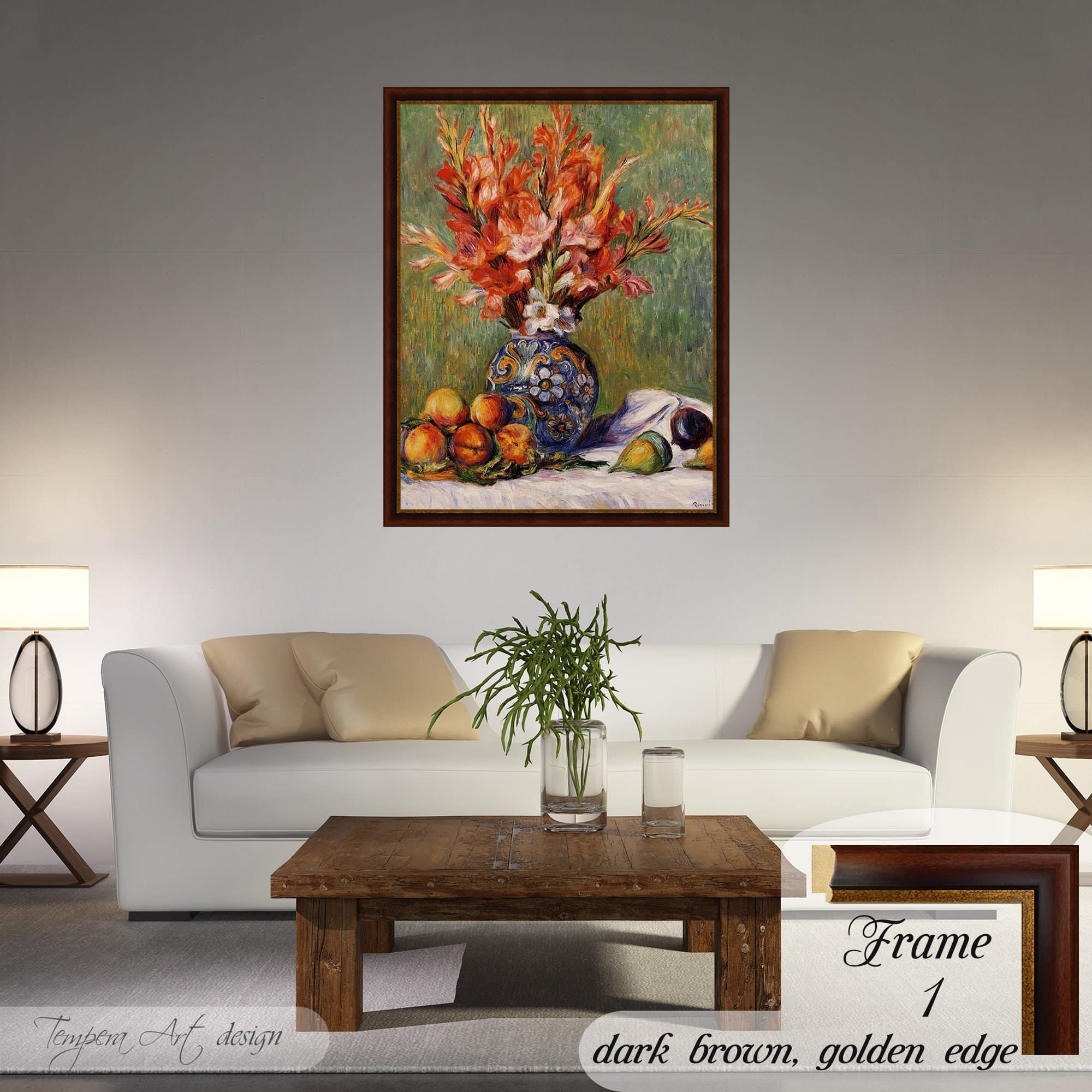 Pierre Auguste Renoir “Flowers and Fruit” print on canvas offered with different wooden frames or as an unframed wall art decor.