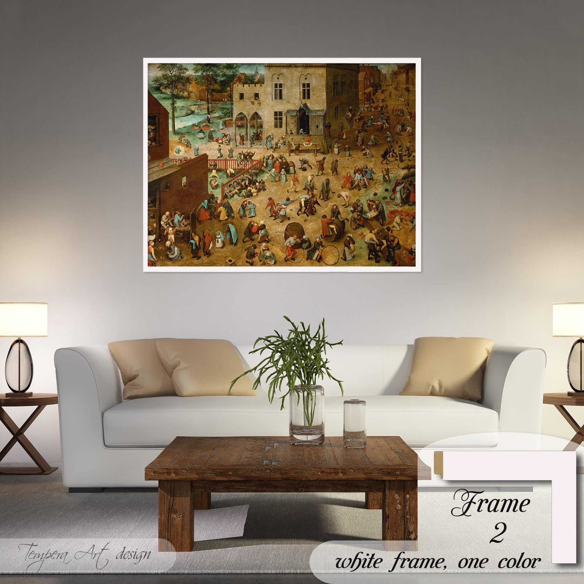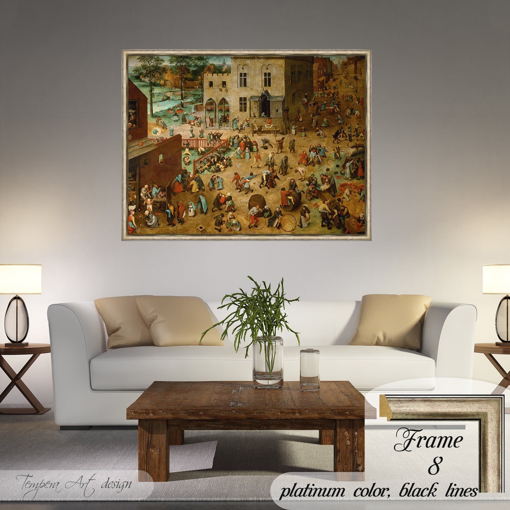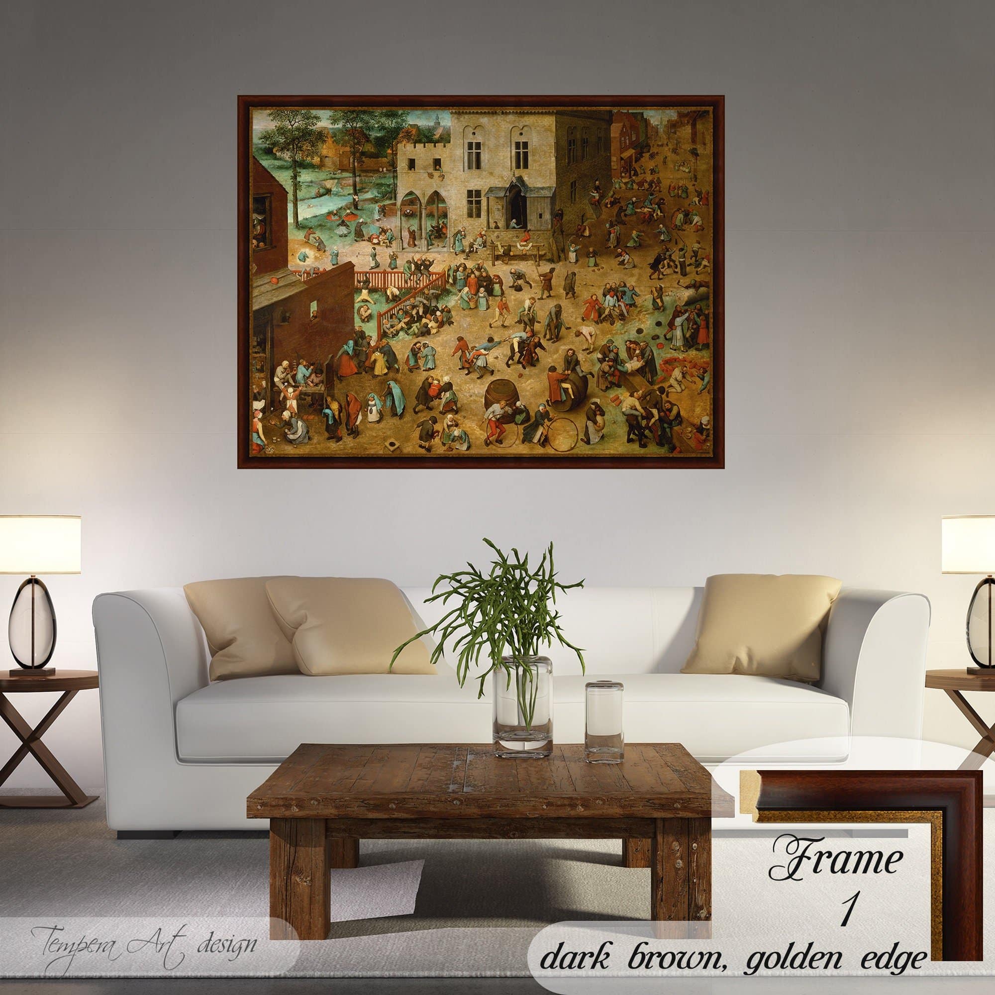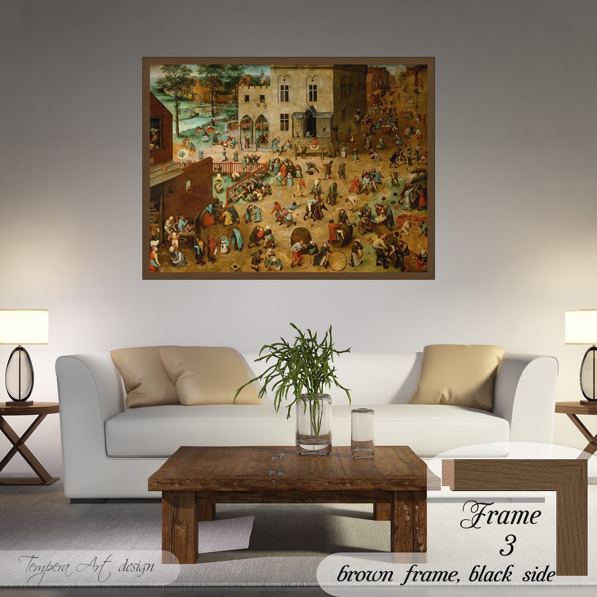Pieter Bruegel The Elder “Children’s Games” print on canvas offered with different wooden frames or as an unframed wall art decor.