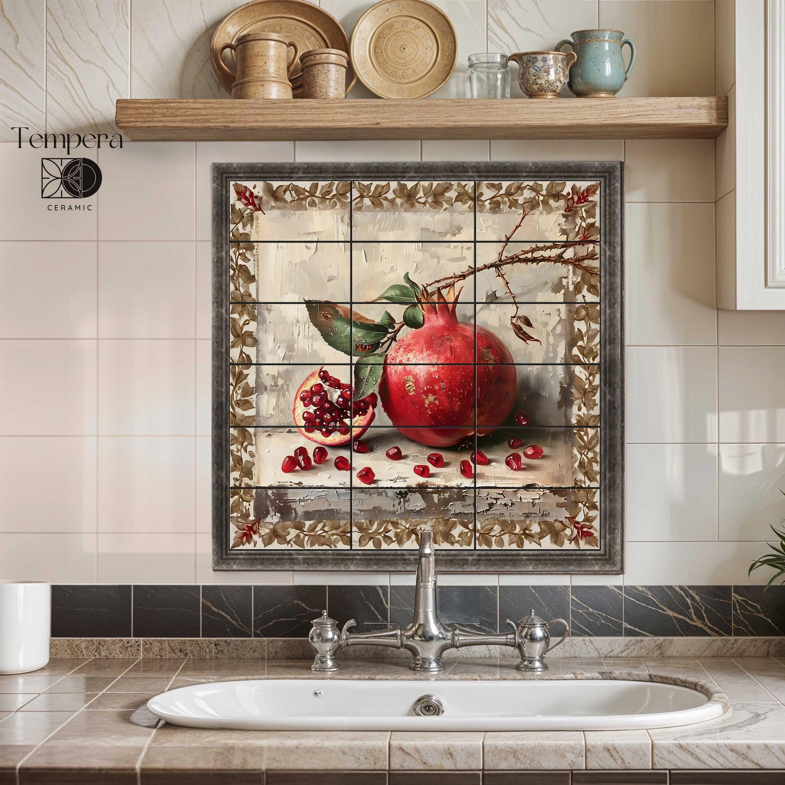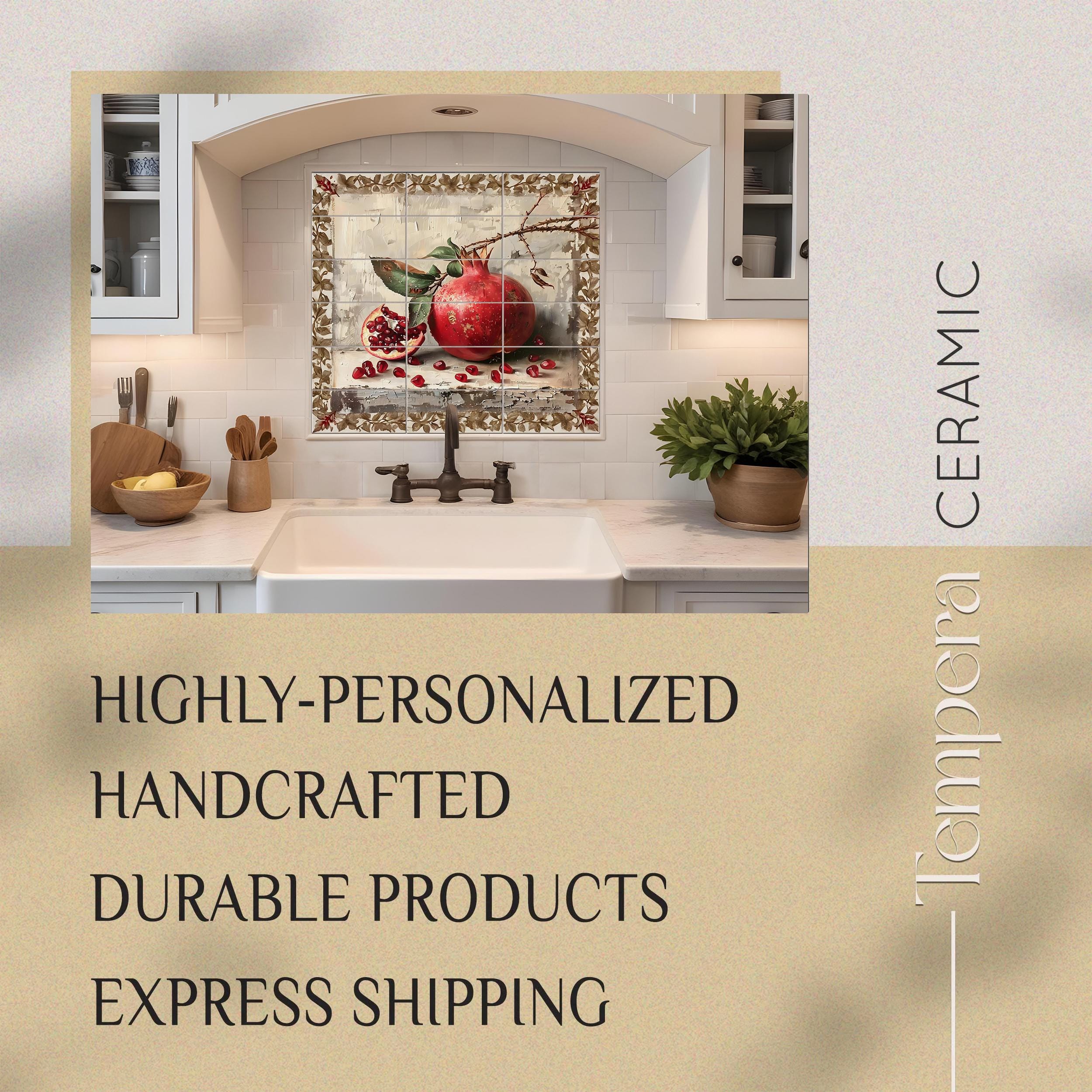 Kitchen backsplash pomegranates tile mural, handcrafted and can be custom-made to fit your space. Our tiles are both unique and made to last. We can offer various customizations of the design and the sizes, or we can bring your vision to life with a completely different and unique look.