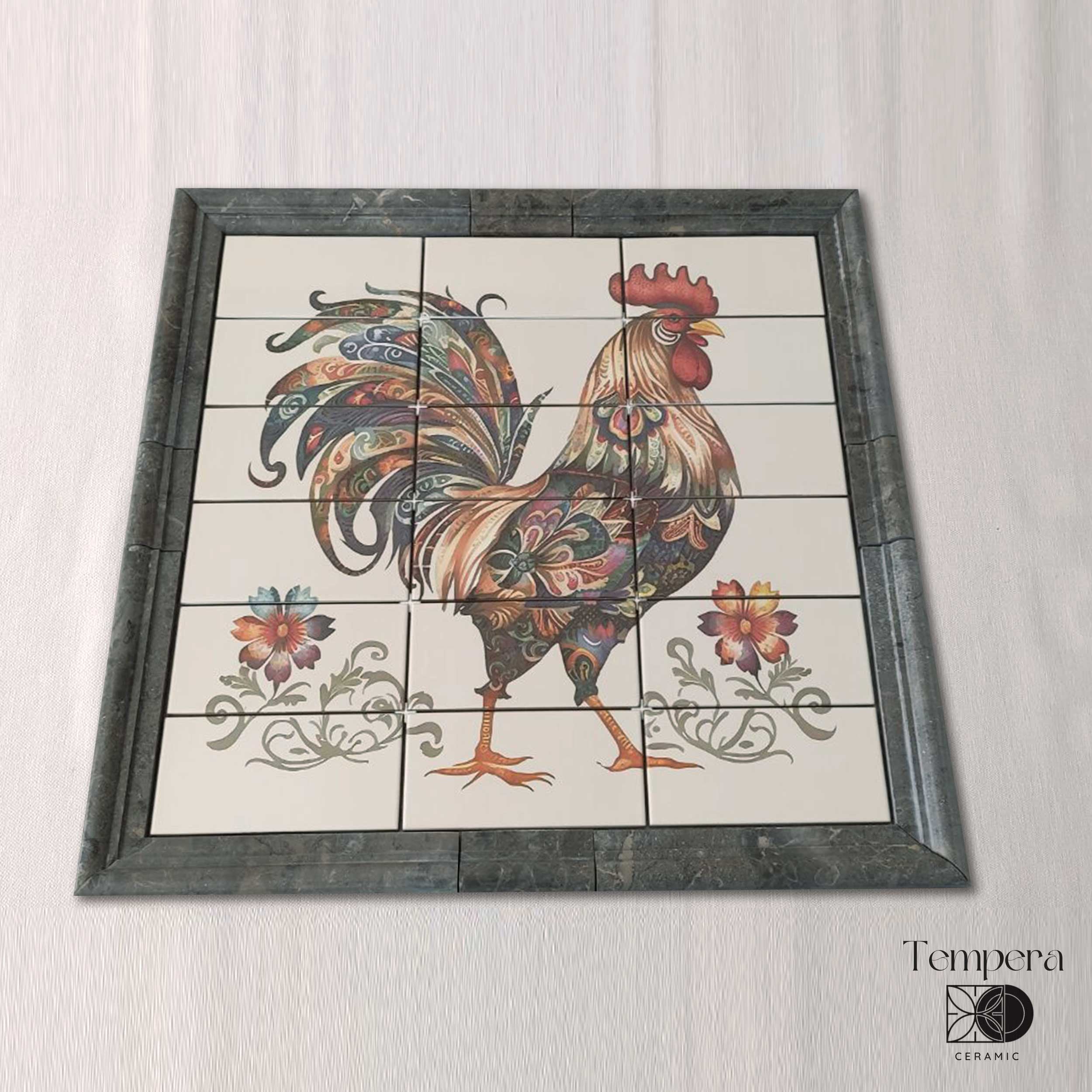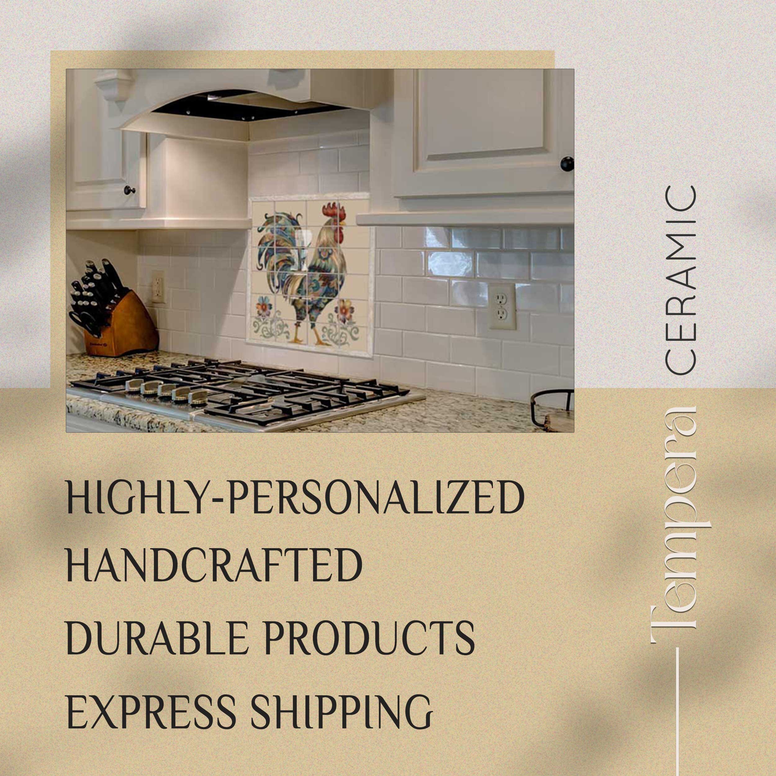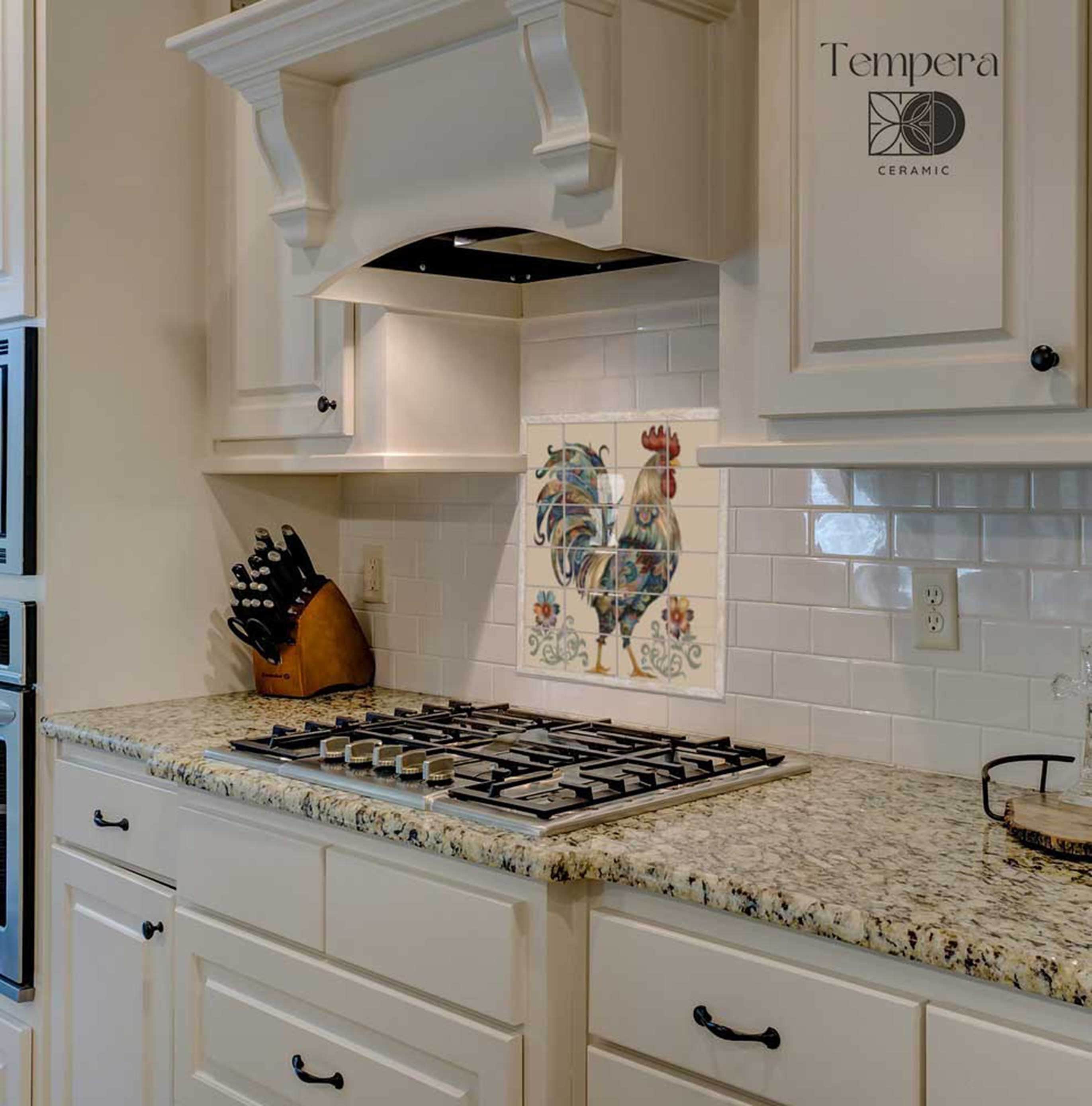Rooster backsplash, handcrafted and custom-made to fit your space. Our tiles are both unique and made to last. We can offer various customizations of the design and the sizes, or we can bring your vision to life with a completely different and unique look.