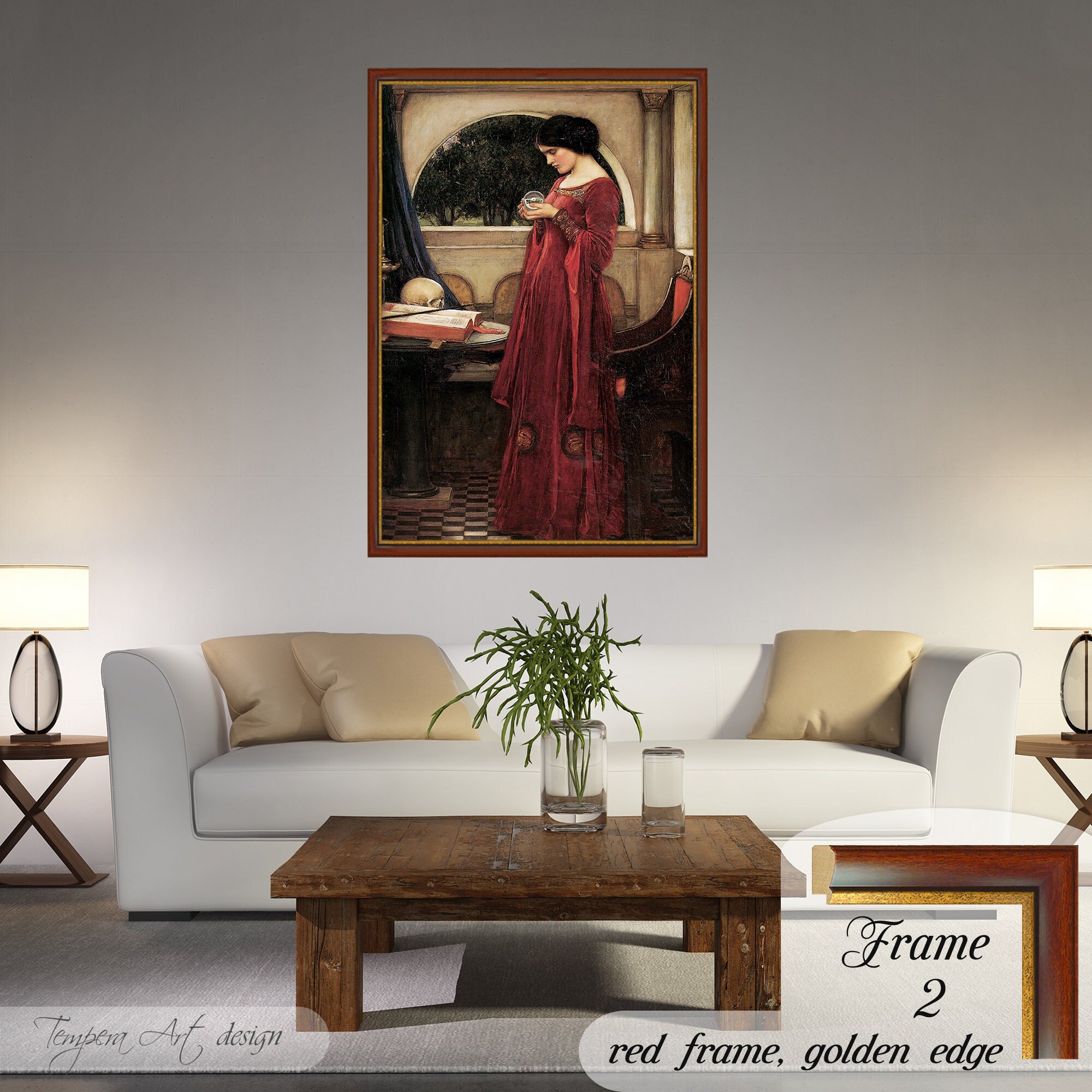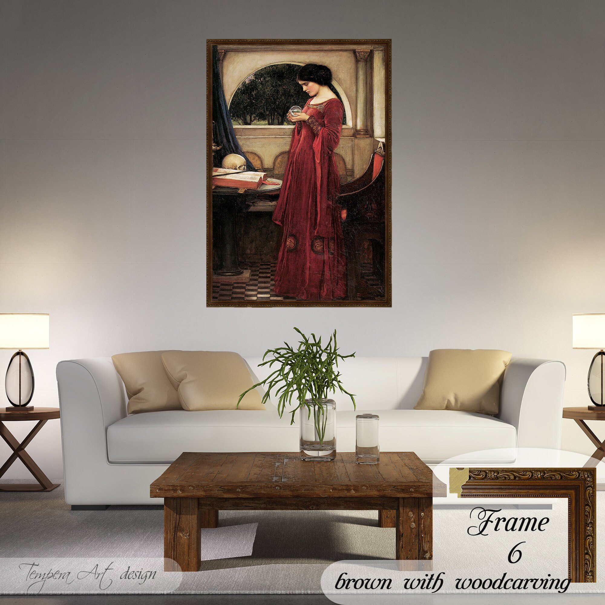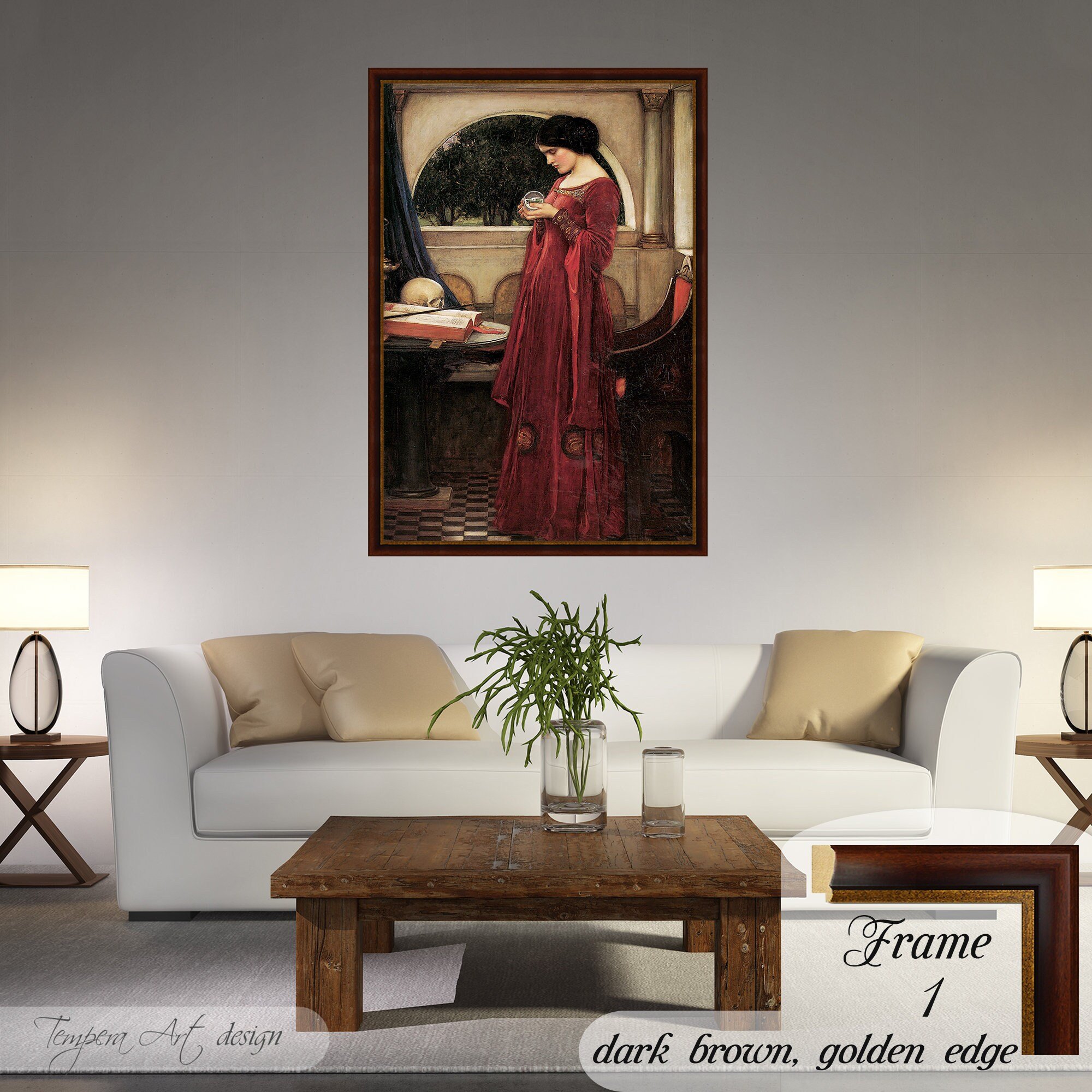 The Crystal Ball by John William Waterhouse Print on canvas offered with different wooden frames or as an unframed wall art decor.