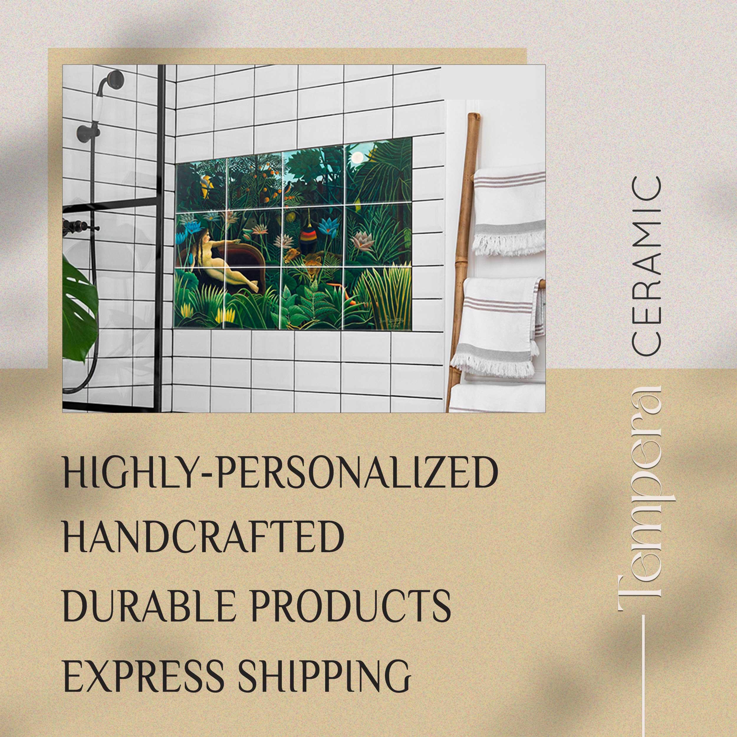 Rousseau The Dream tiles mural, handcrafted and custom-made to fit your space. Our tiles are both unique and made to last. We can offer various customizations of the design and the sizes, or we can bring your vision to life with a completely different and unique look.