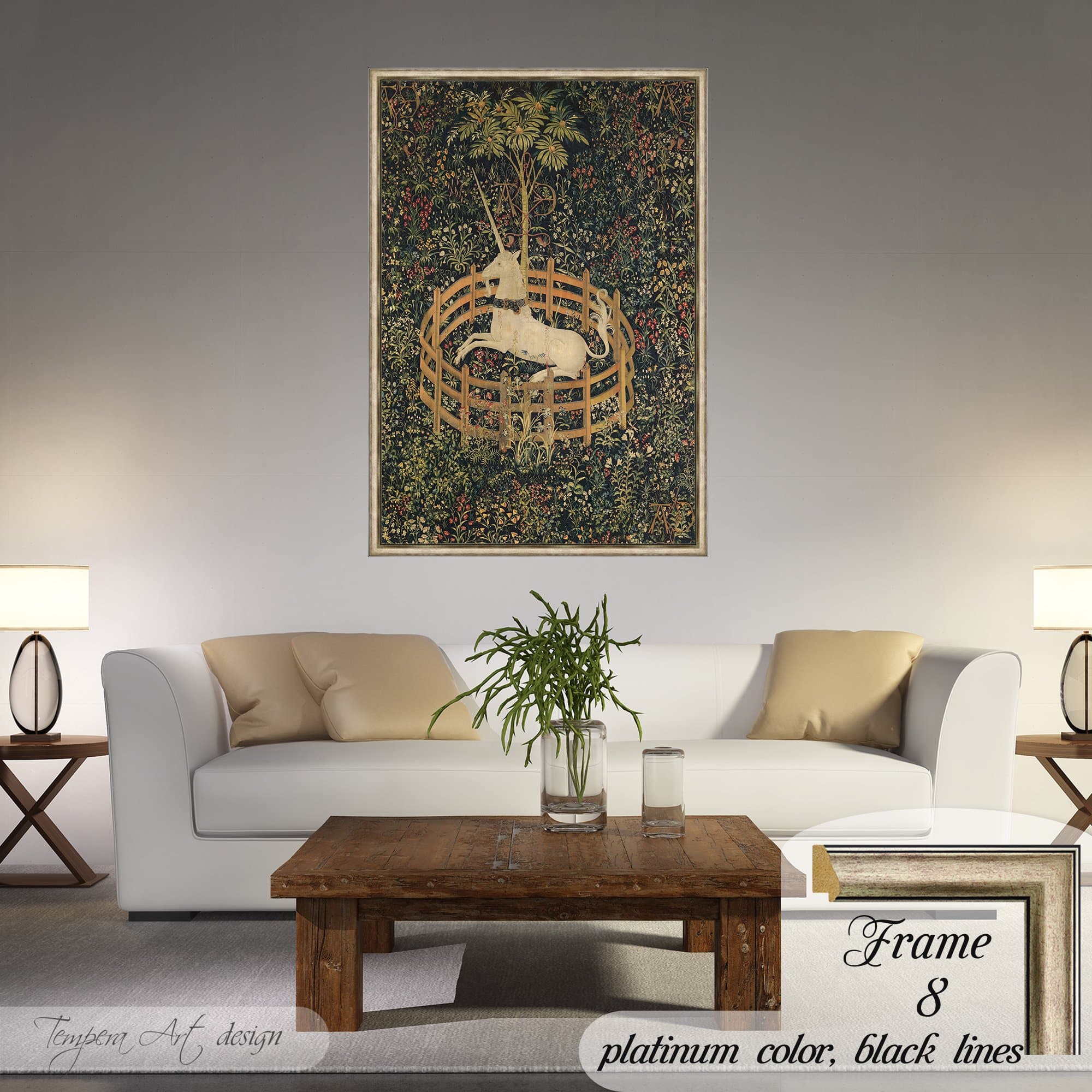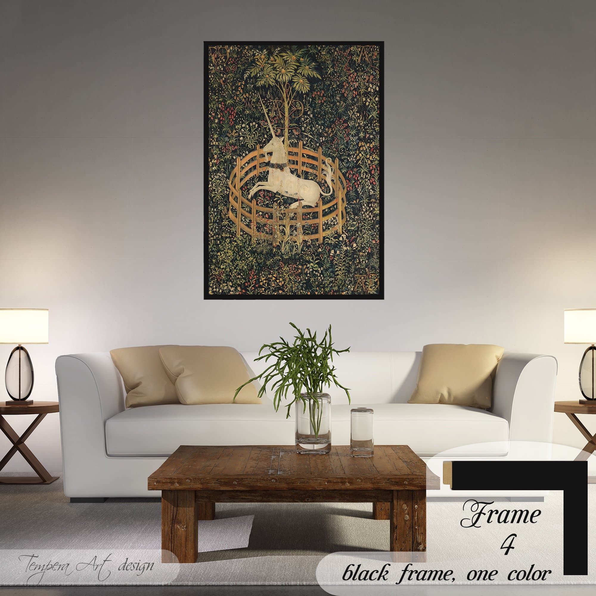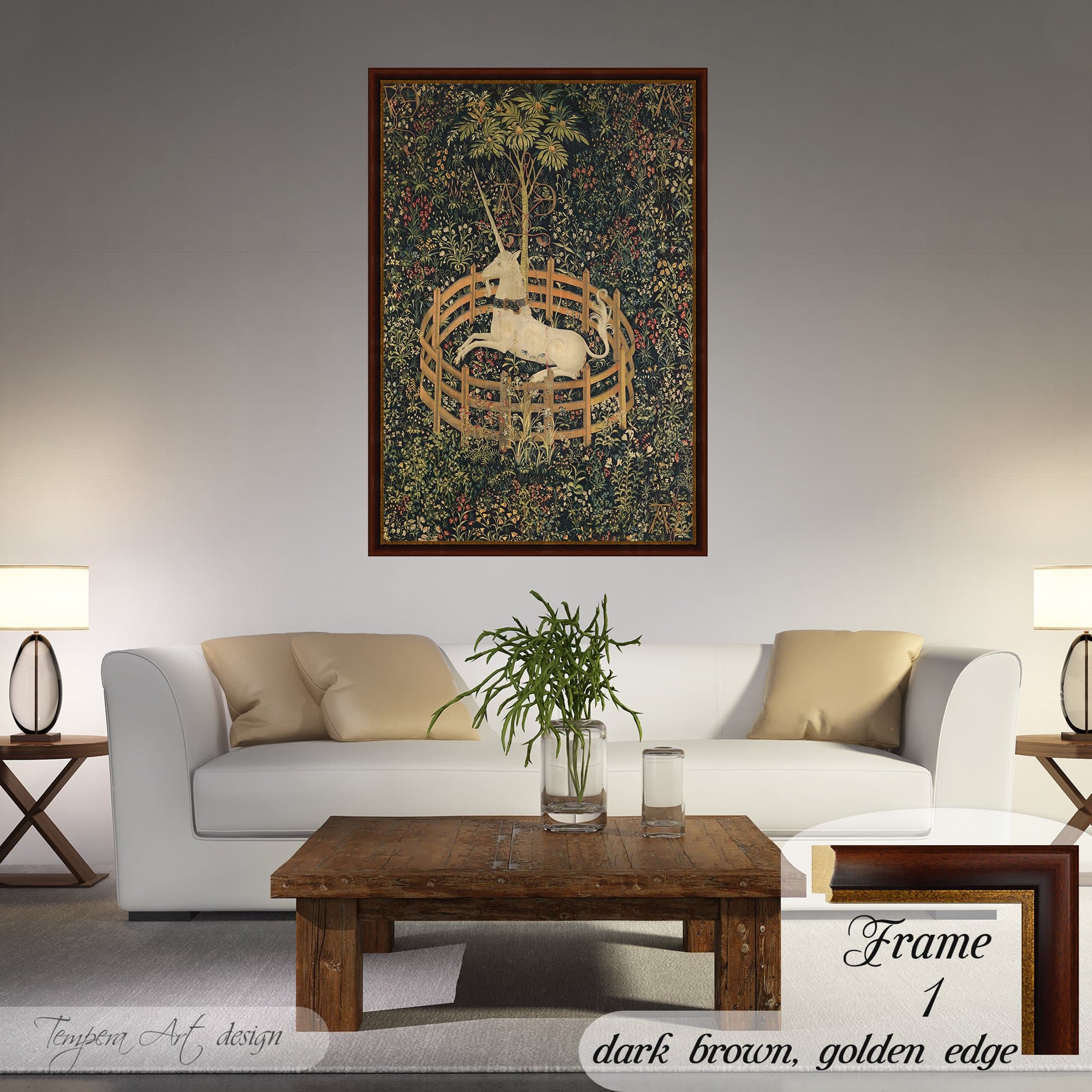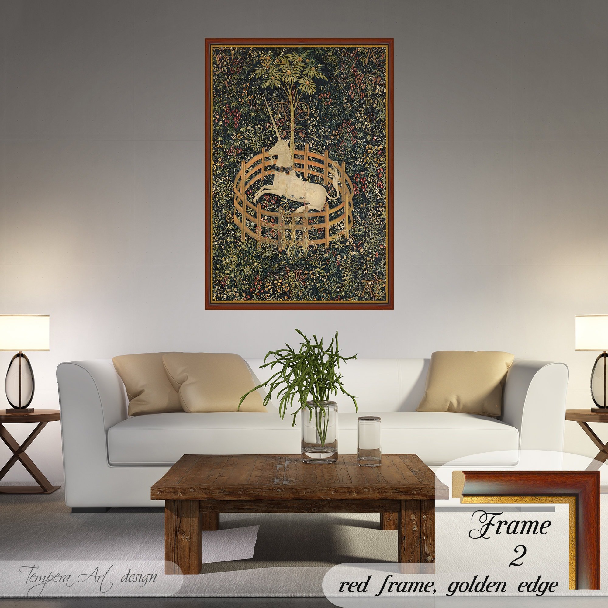 “The Unicorn in Captivity” (The Unicorn Rests in a Garden) tapestry print on canvas offered with different wooden frames or as an unframed wall art decor.