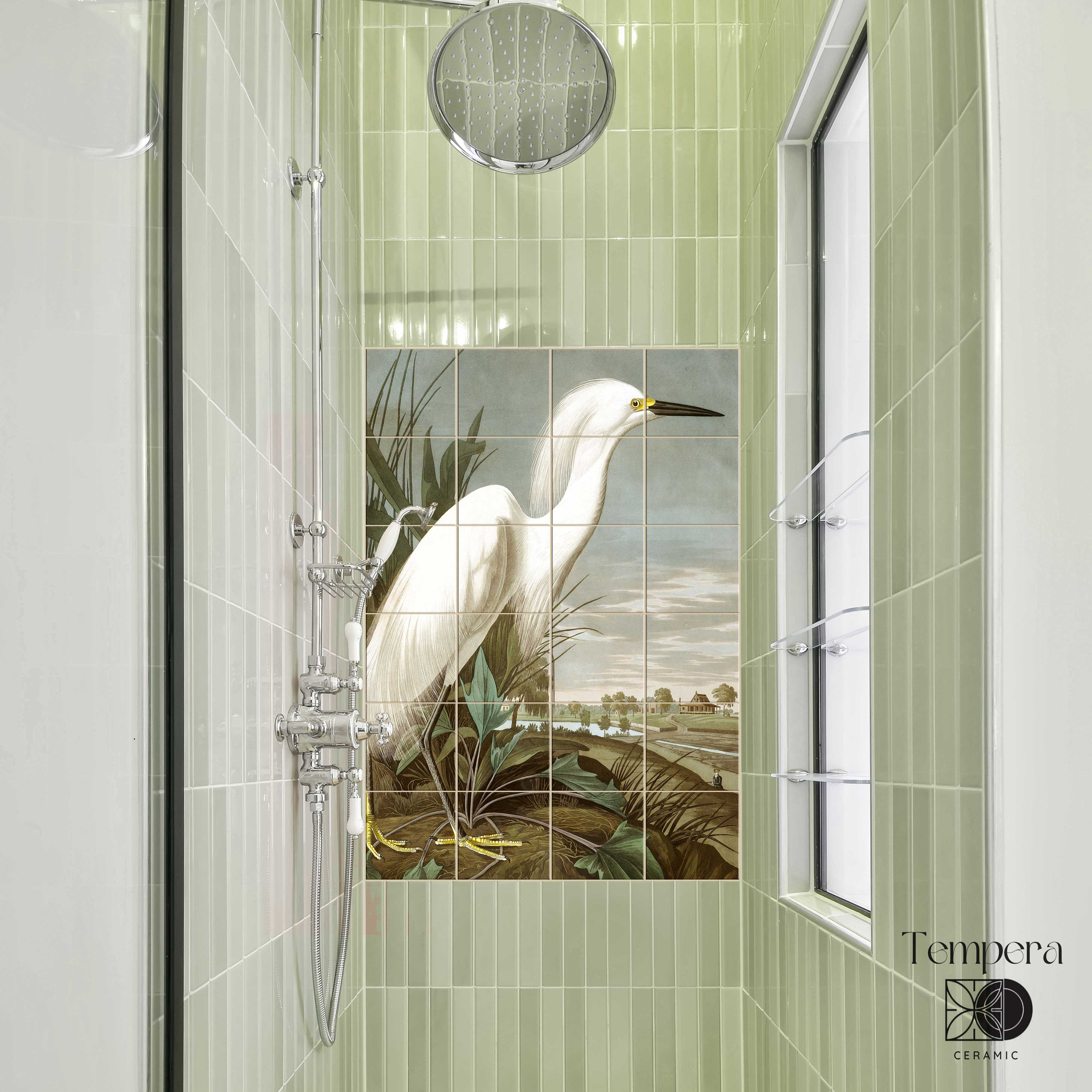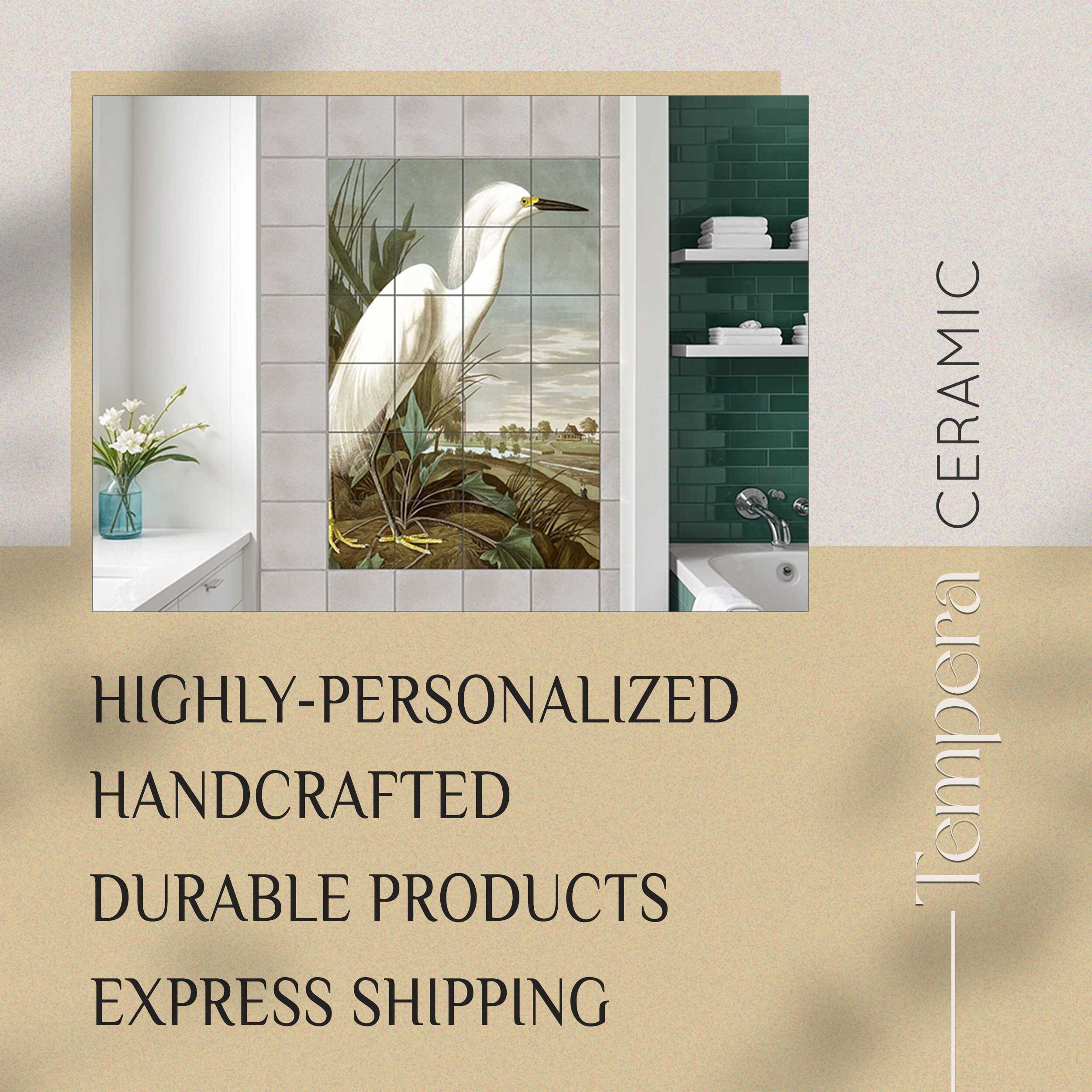 Mural ceramic tile set of Snowy Heron or White Egret by Audubon. Each tile is printed with high-quality image that goes deep into the coating layer of the tile, ensuring the durability of the product.