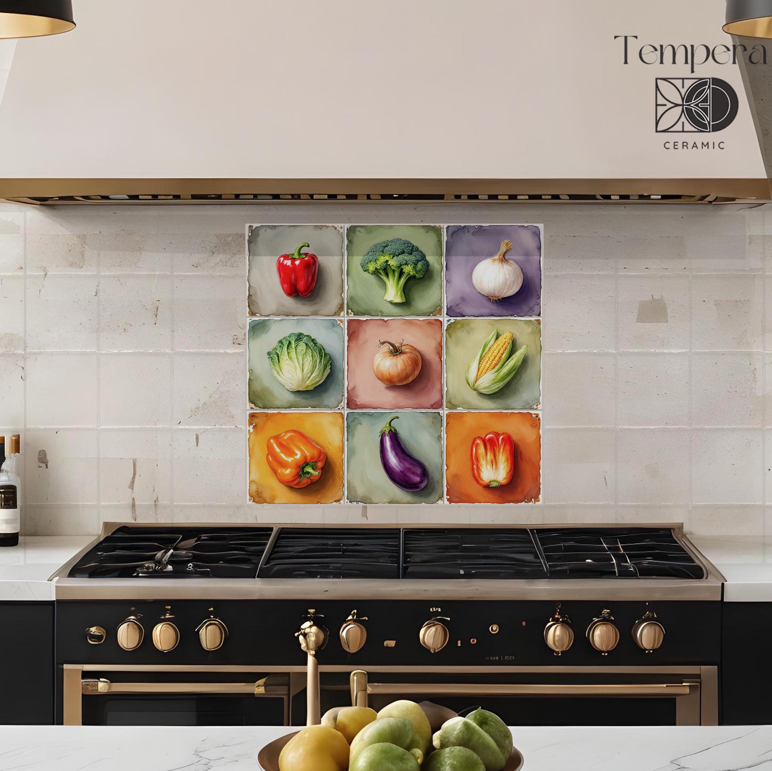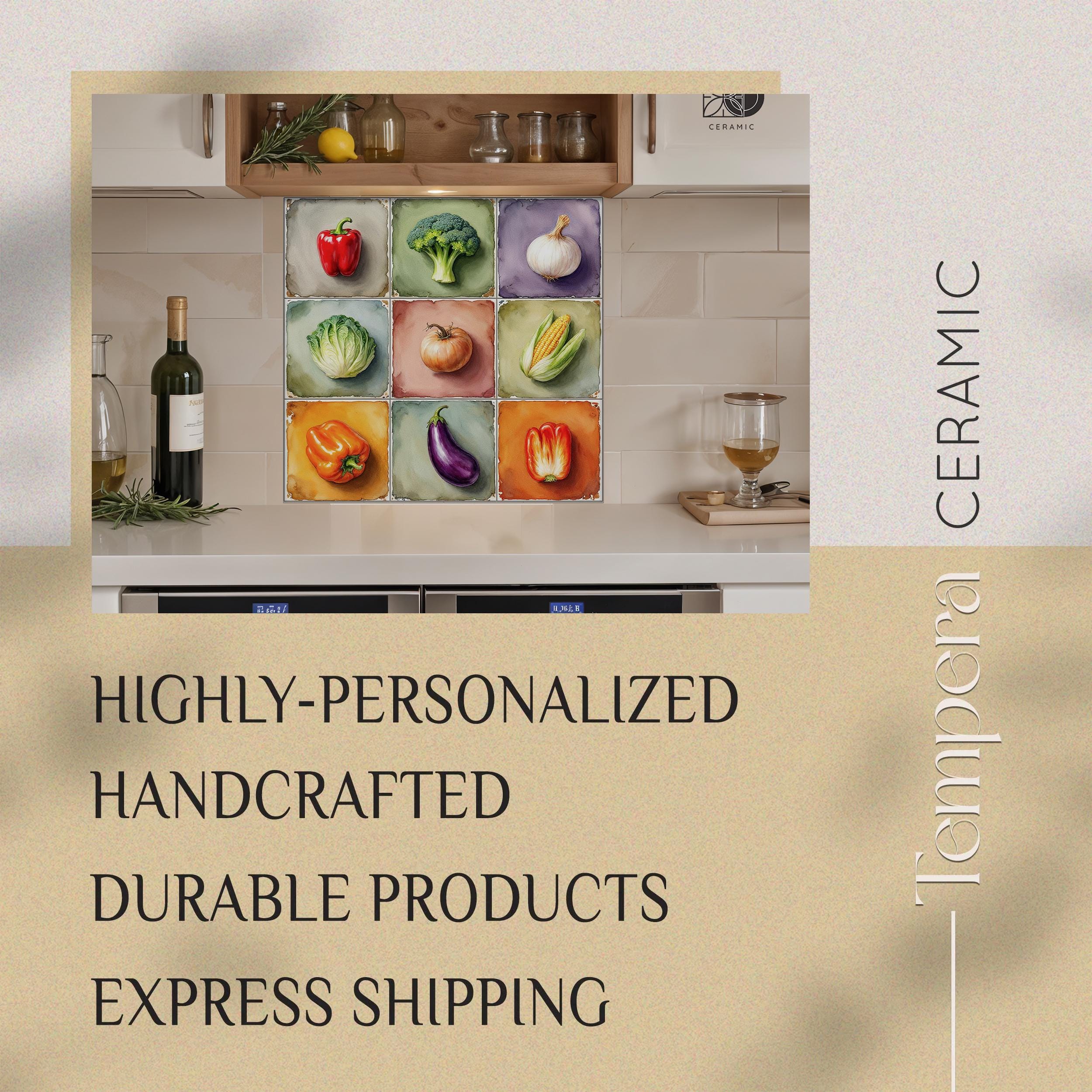 Vegetables kitchen tiles backsplash, handcrafted and custom-made to fit your space. Our tiles are both unique and made to last. We can offer various customizations of the design and the sizes, or we can bring your vision to life with a completely different and unique look.