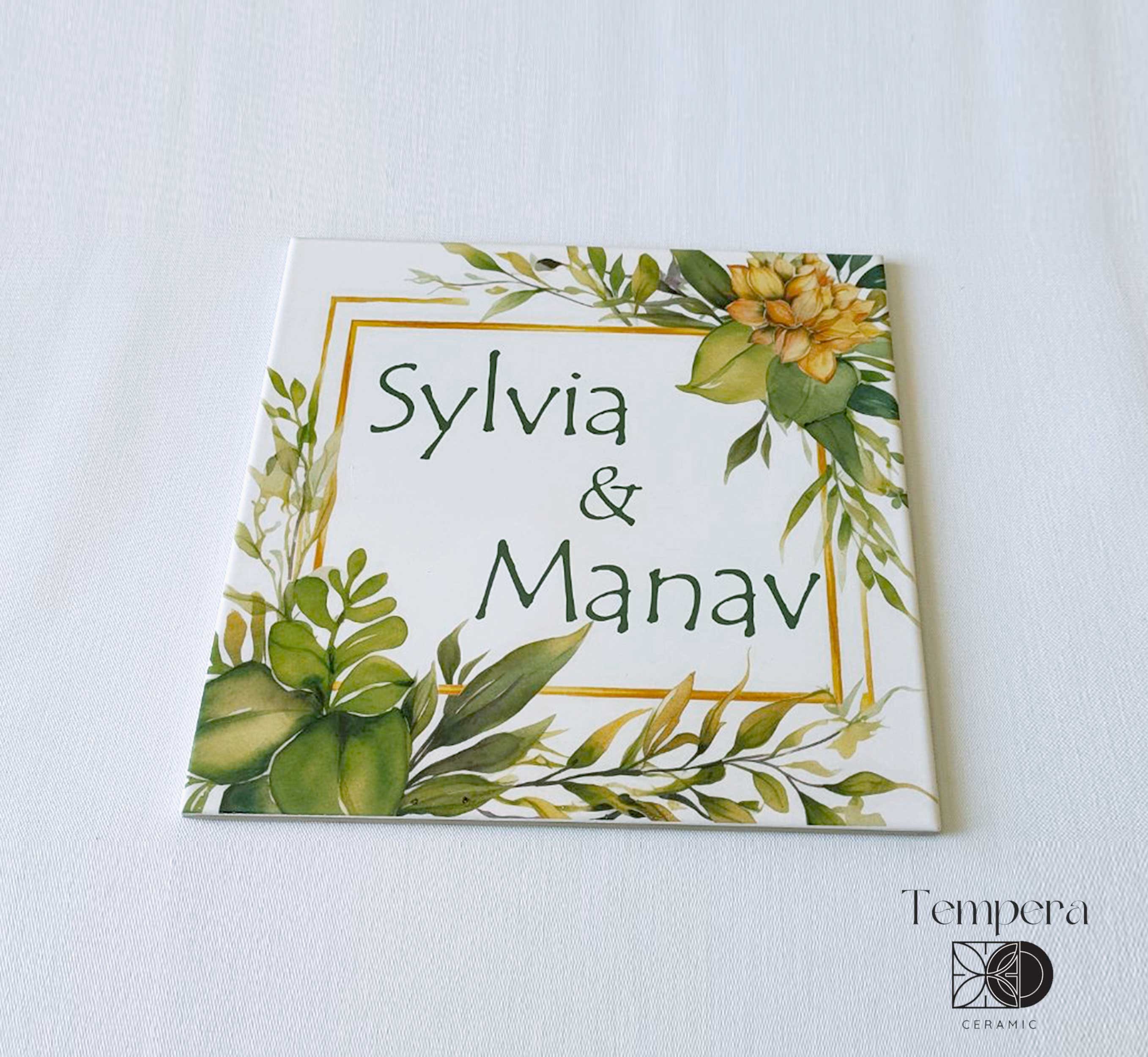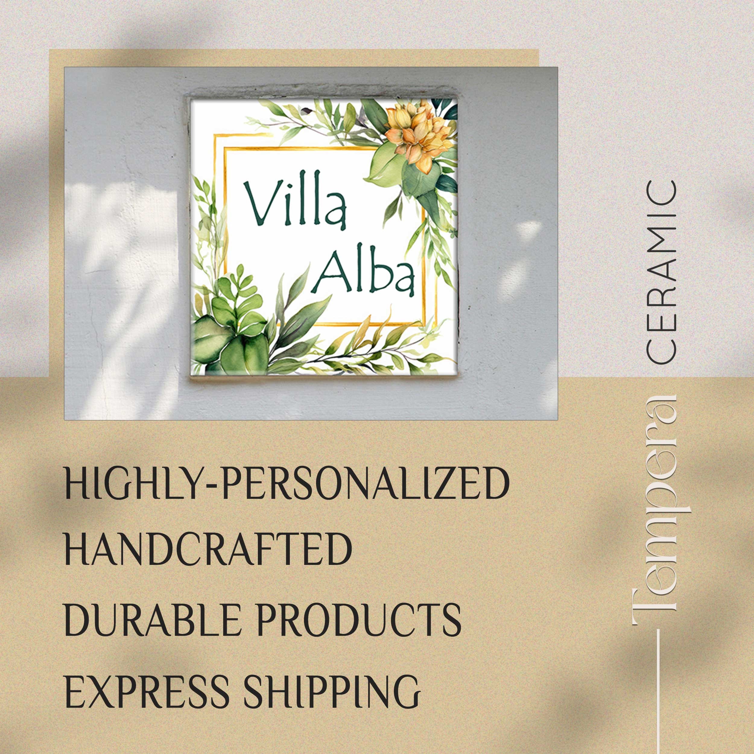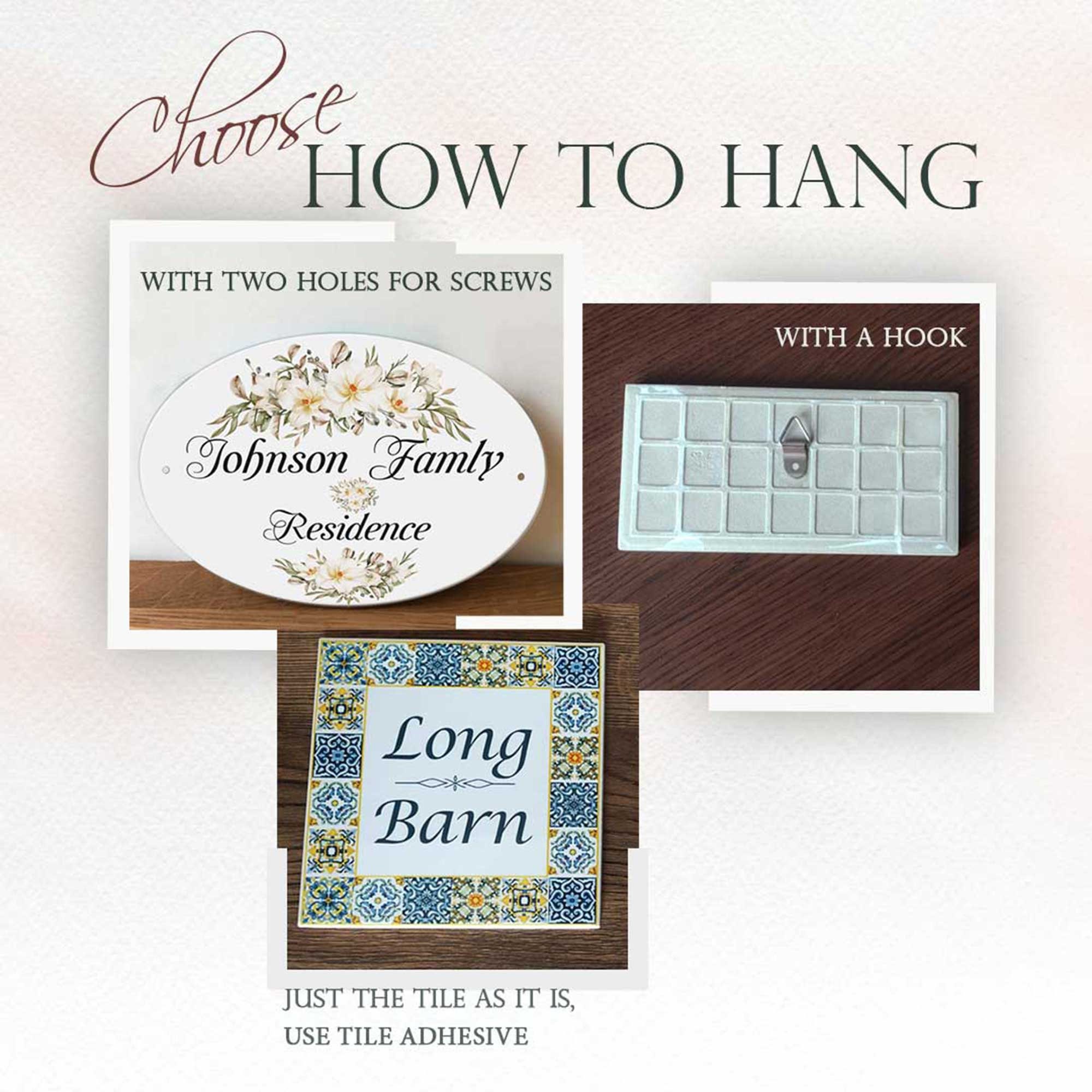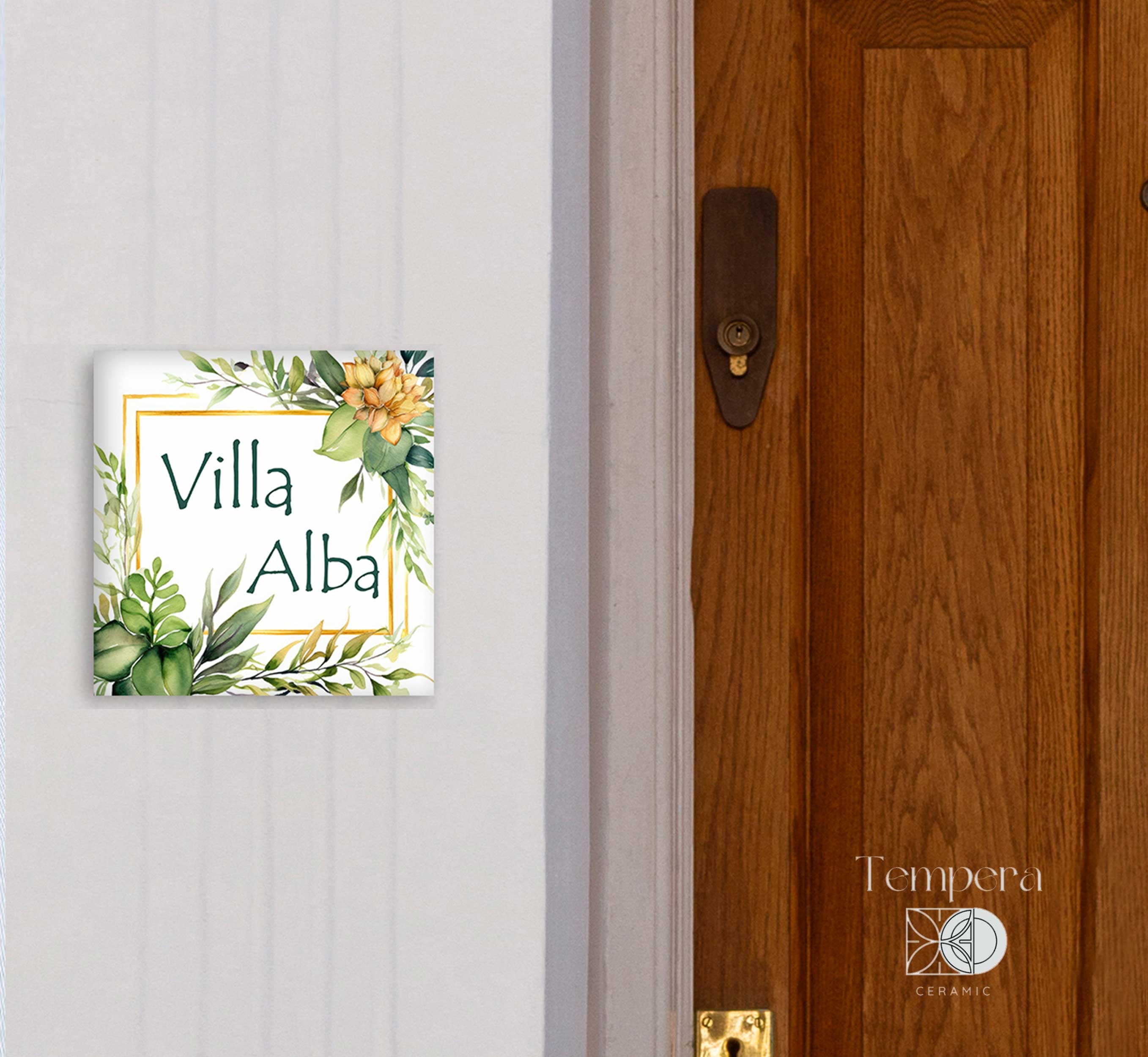 Tropcal style house name or number plaque. With this handcrafted porcelain tile you can add a stylish elemnt to your fornt door. Each tile is printed with high-quality image that goes deep into the coating layer of the tile, ensuring the durability of the product.