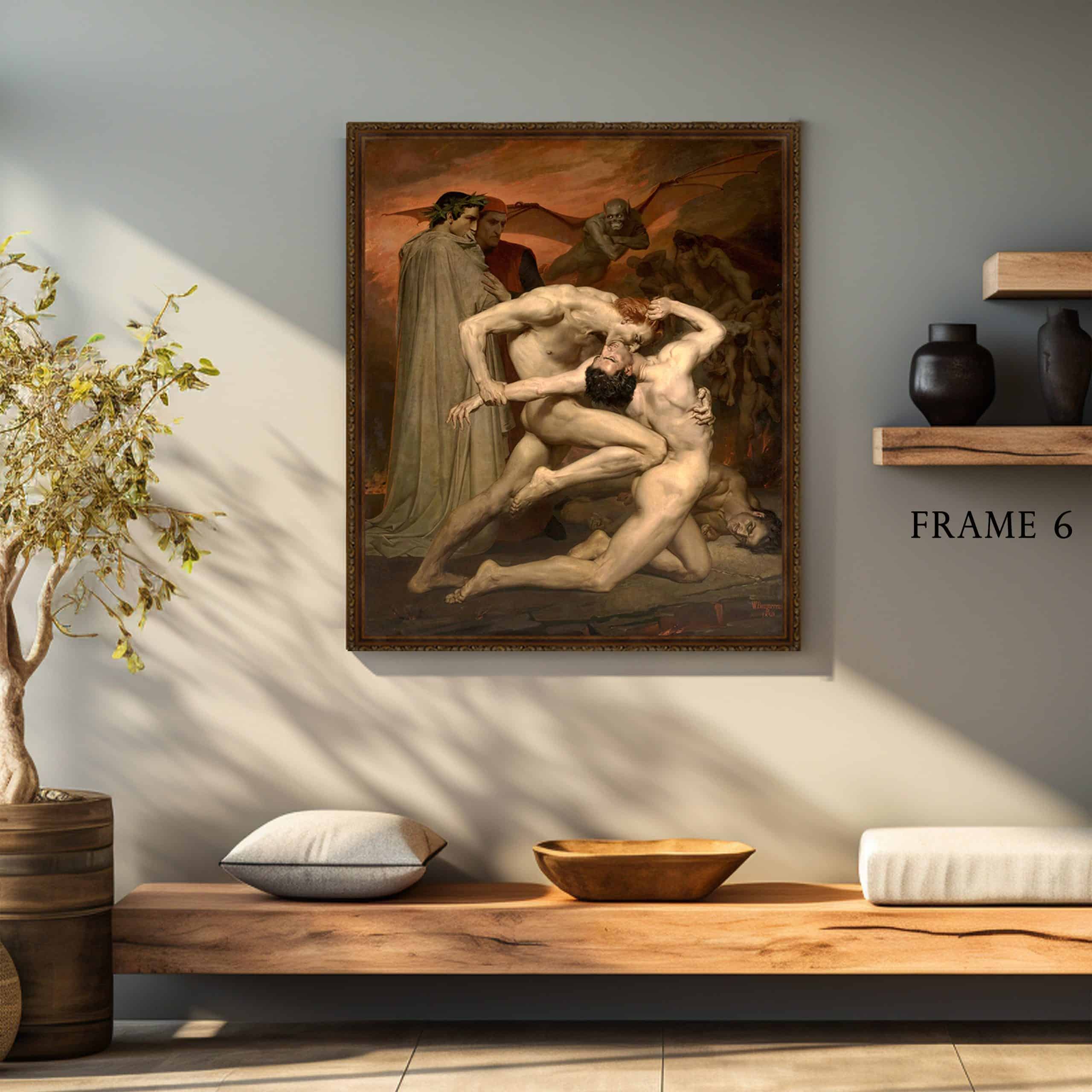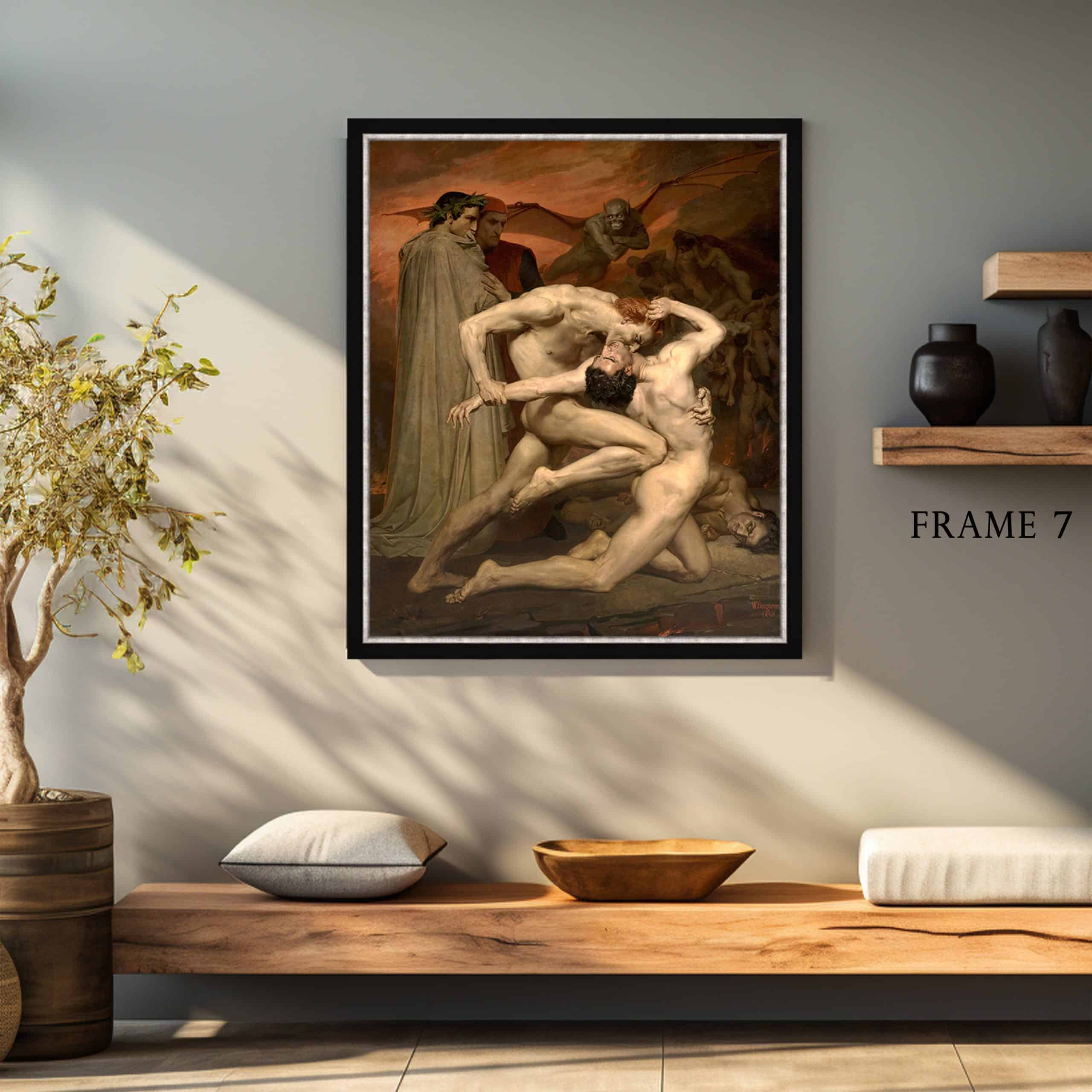 William-Adolphe Bouguereau Dante and Virgil in hell print on canvas offered with different wooden frames or as an unframed wall art decor.