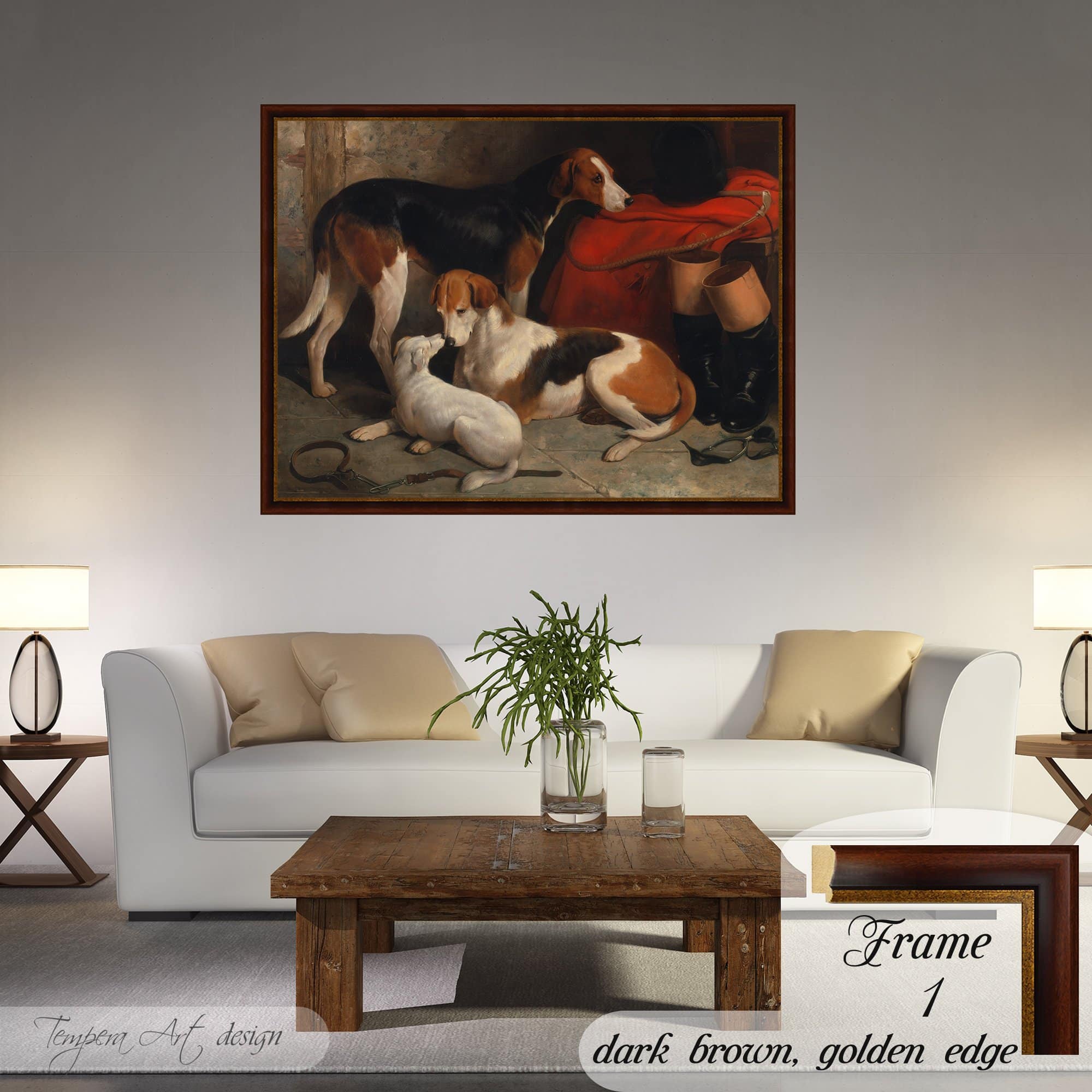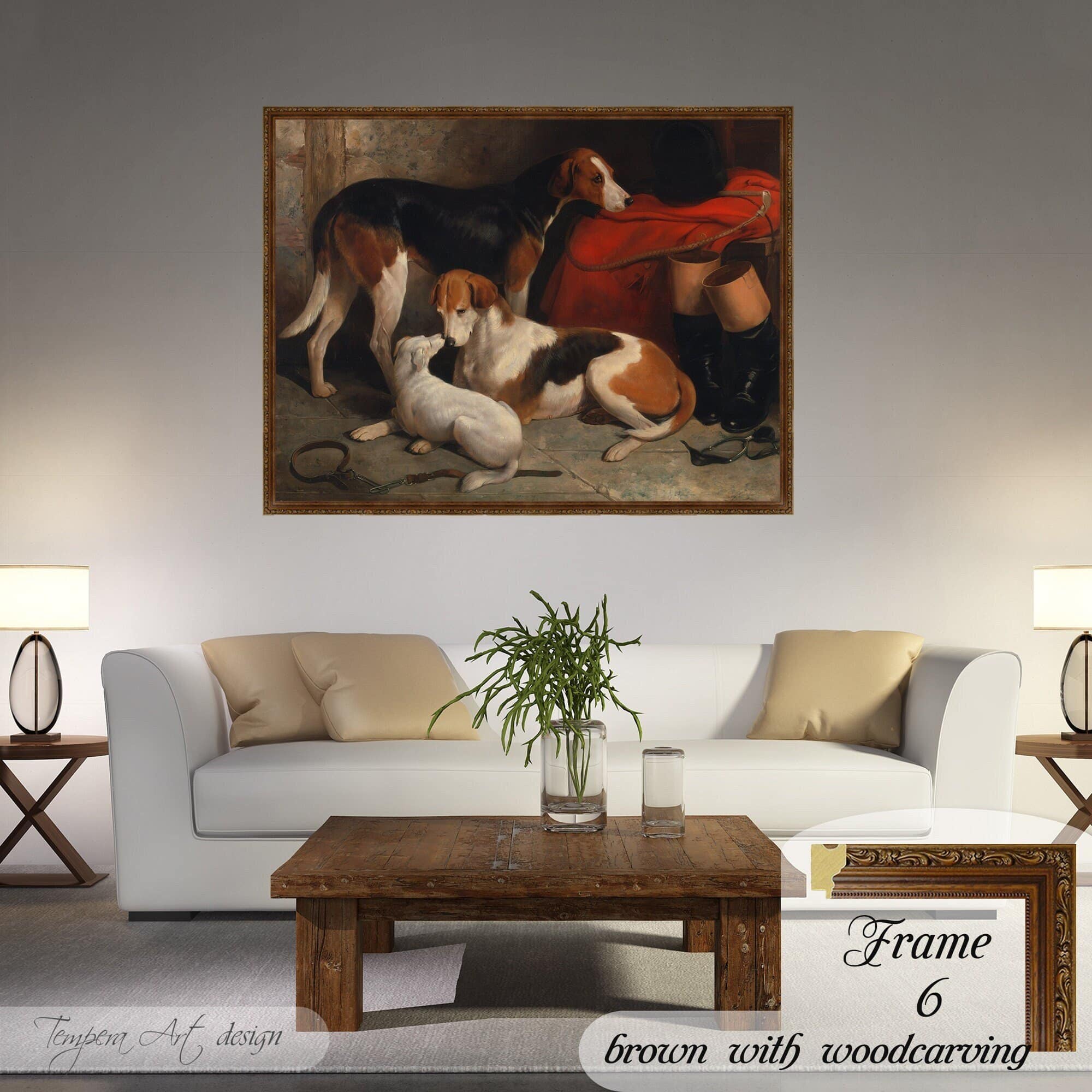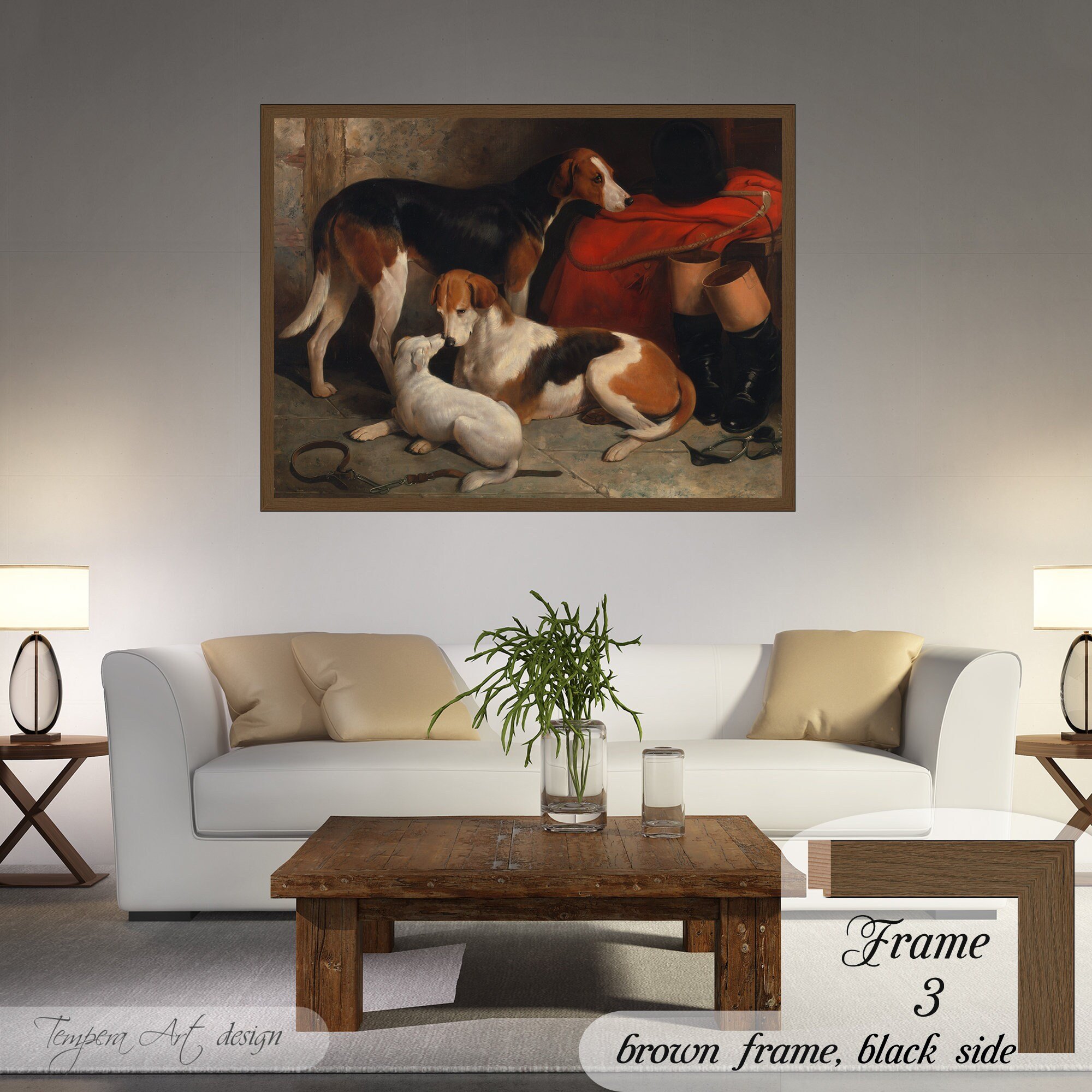 William Barraud “A Couple of Foxhounds With a Terrier” print on canvas offered with different wooden frames or as an unframed wall art decor.