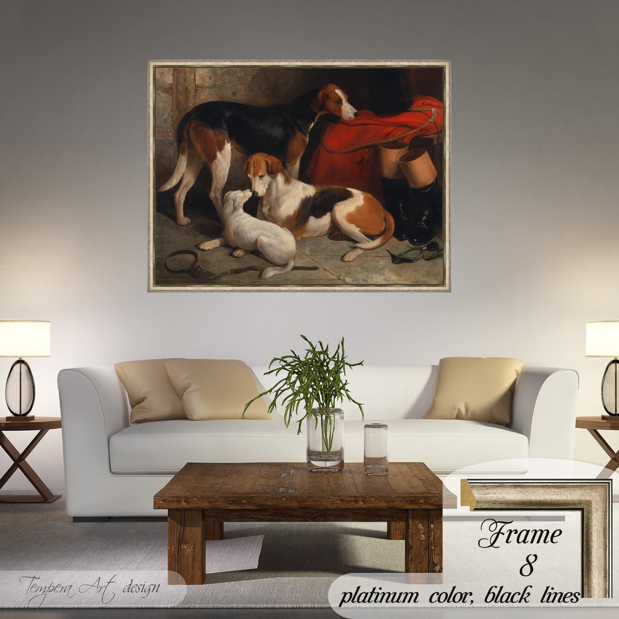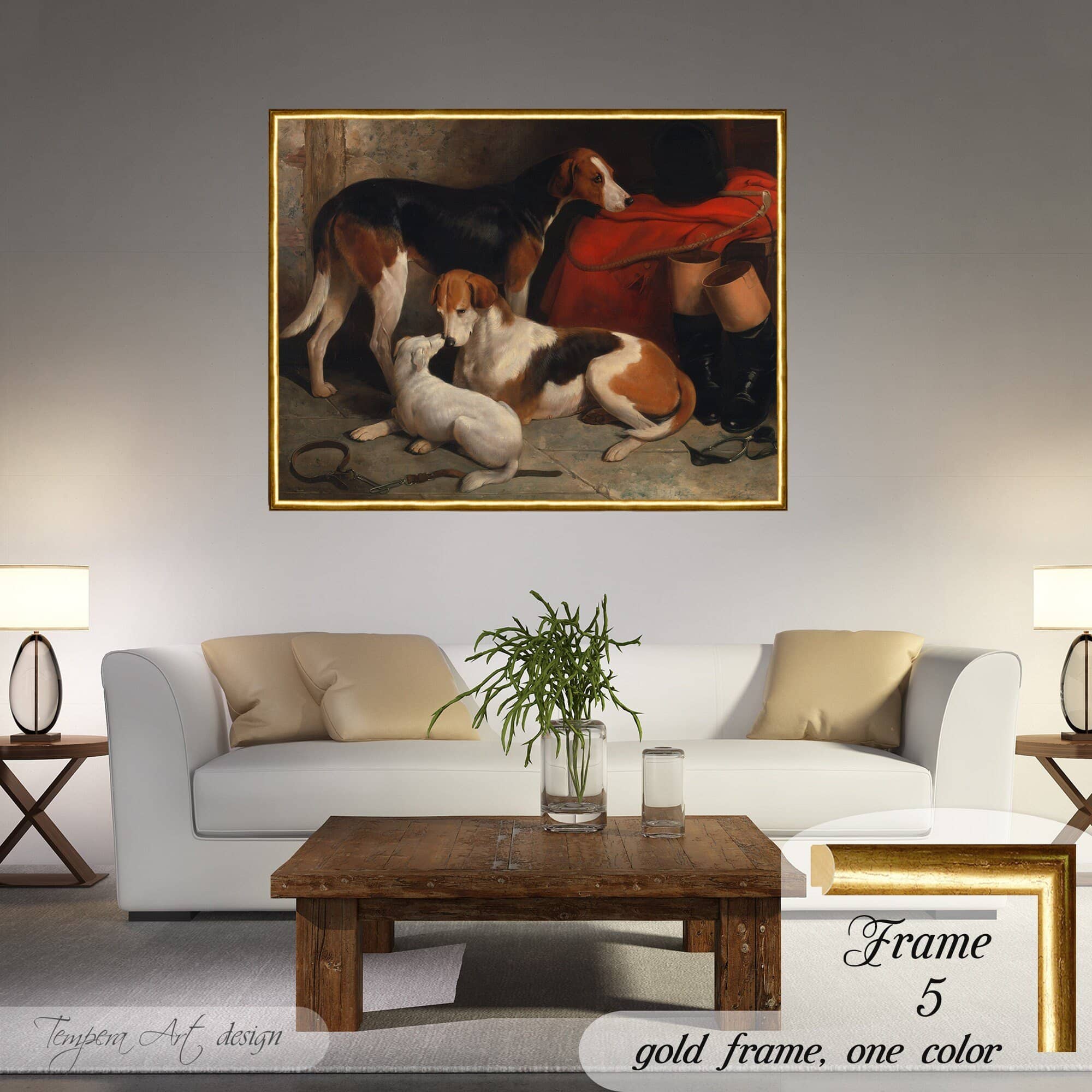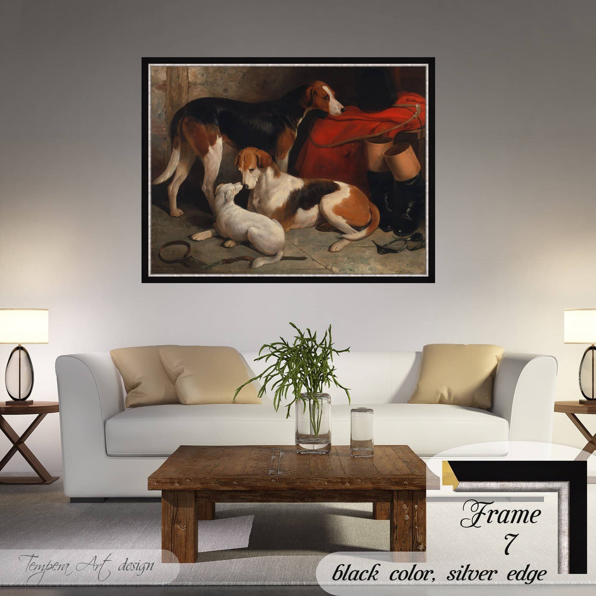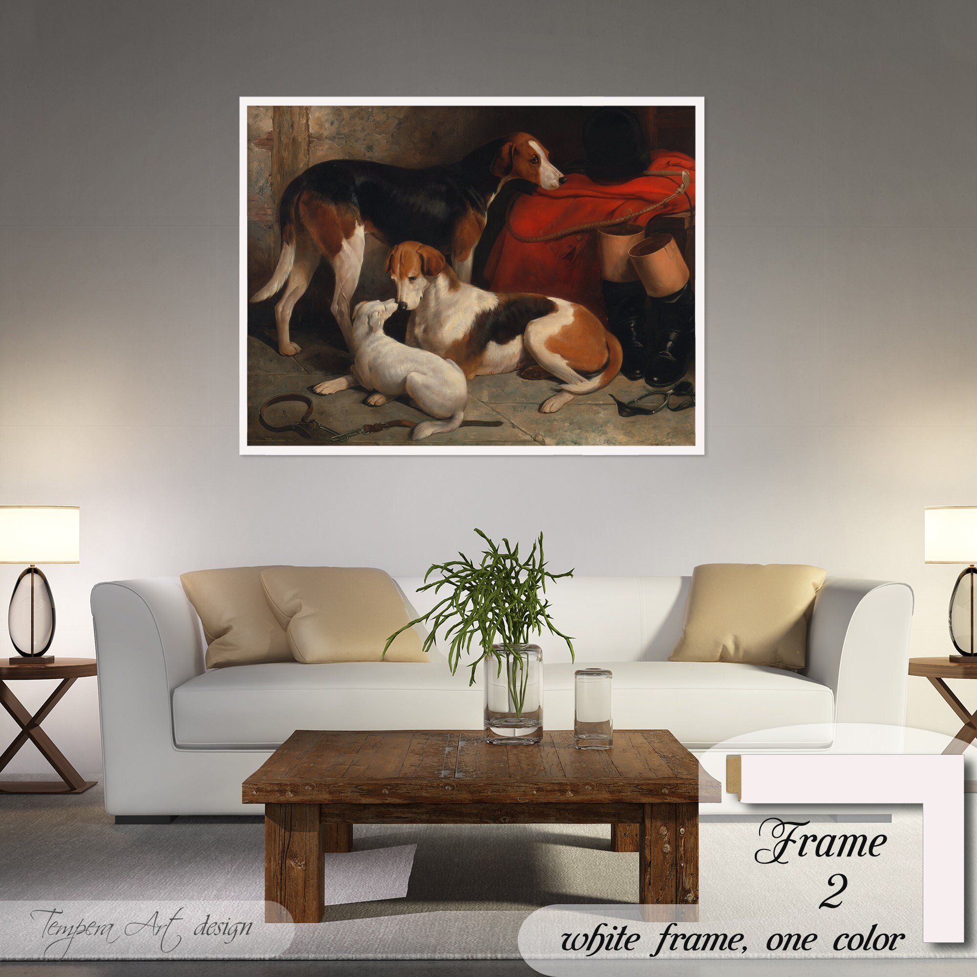 William Barraud “A Couple of Foxhounds With a Terrier” print on canvas offered with different wooden frames or as an unframed wall art decor.