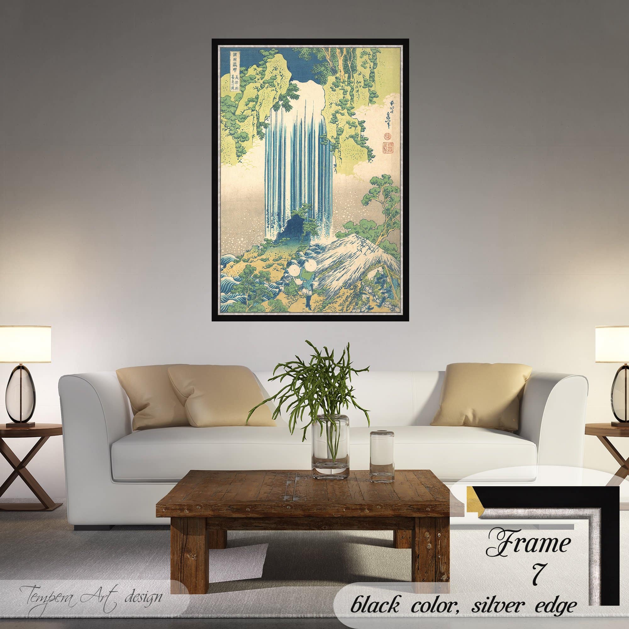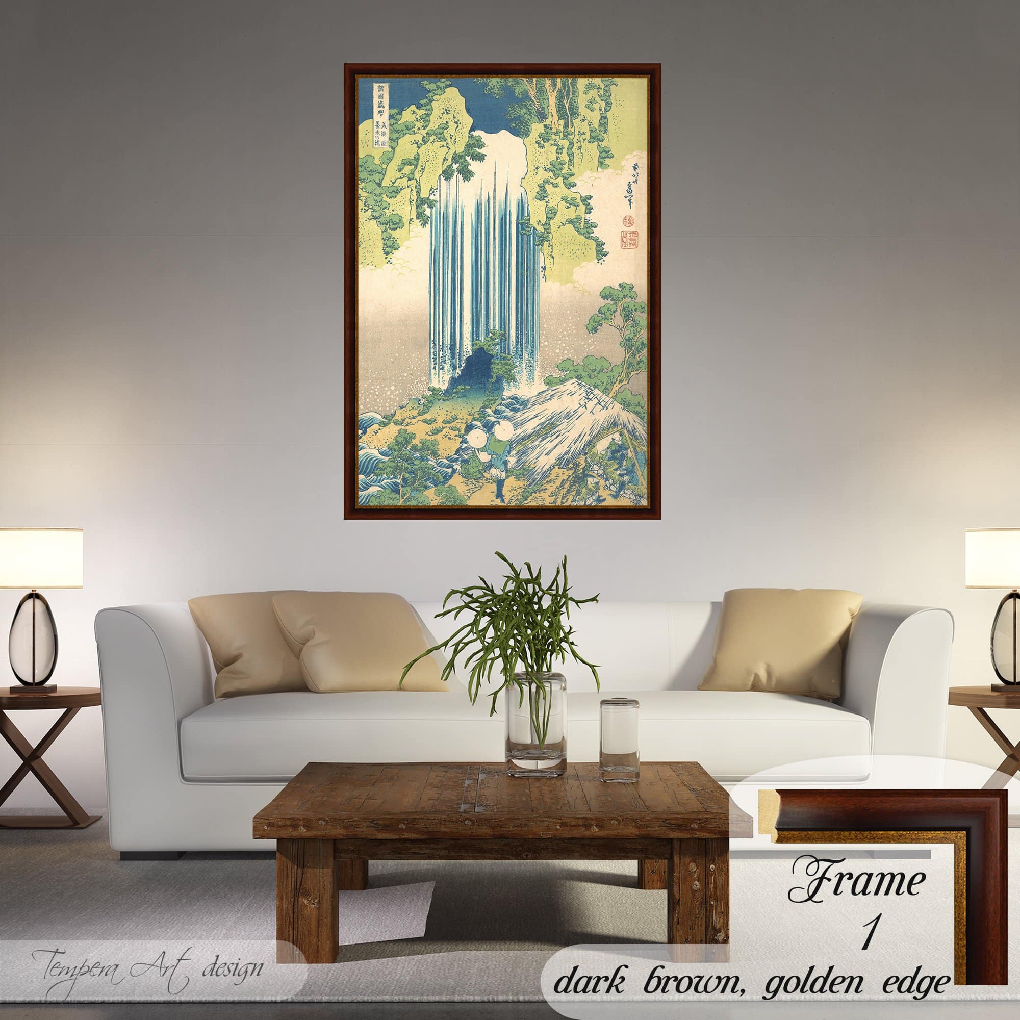 Katsushika Hokusai “Yoro Waterfall in Mino Province, from the series A Tour of Waterfalls in Various Provinces” print on canvas japanese Ukiyo-e art offered with different wooden frames or as an unframed wall decor.